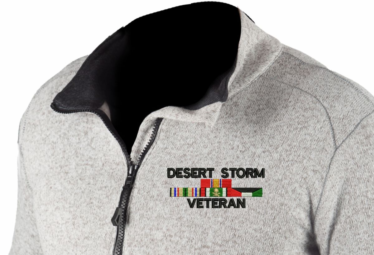 Striving to provide you with the highest quality apparel made in the United States, MilitaryBest is proud to offer this Desert Storm Veteran with 4 Service Ribbons Knit HEATR Long Sleeve Full Zip. Manufactured by WSI Sportswear in Minnesota and Embroidered by us here at MilitaryBest in Alabama; this shirt is 100% Made in the USA! We aim to provide you with soft, comfortable, dry-fit, American-made clothing that allows you to be your best. HEATR is a high-tech material developed by WSI that helps keep you up to 40% warmer than other materials on the market. Fibers that are integrated within the fabric expand and heat up as they come into contact with the skin. Since the fibers are integrated in the fabric, they will not wash out. *For washing we recommend machine wash cold with like colors, and line dry.PRODUCT FEATURES