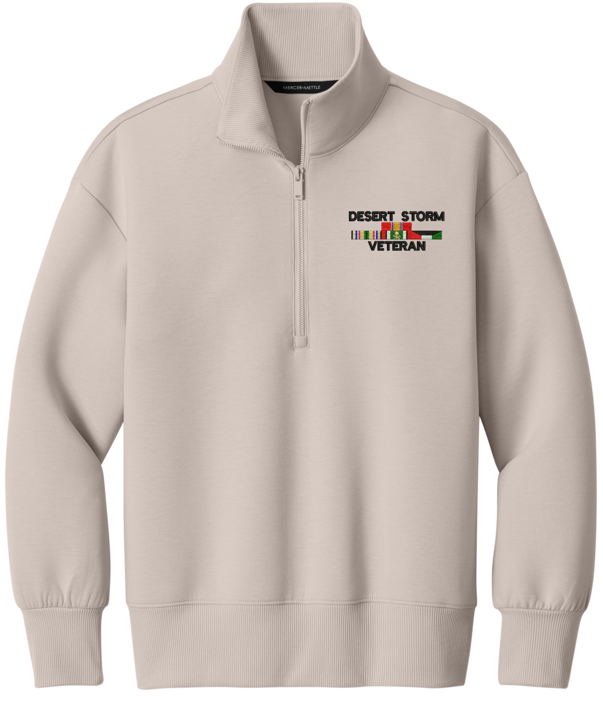 MilitaryBest is proud to offer this Desert Storm Veteran with 4 Service Ribbons Women's Soft Spacer Quarter-Zip. This quarter-zip is embroidered by our MilitaryBest team in Northeast Alabama. These quarter-zips are made using spacer yarn to provide light insulation with a soft structure, they also fight odor and provide light UV ray protection.Care Instructions: Turn Garment Inside Out. Machine Wash Cold With Like Colors. Only Non-Chlorine Bleach, When Needed. Tumble Dry Low, Remove Promptly. Cool Iron, If Necessary. Do Not Use Fabric Softeners Or Dryer Sheets.
