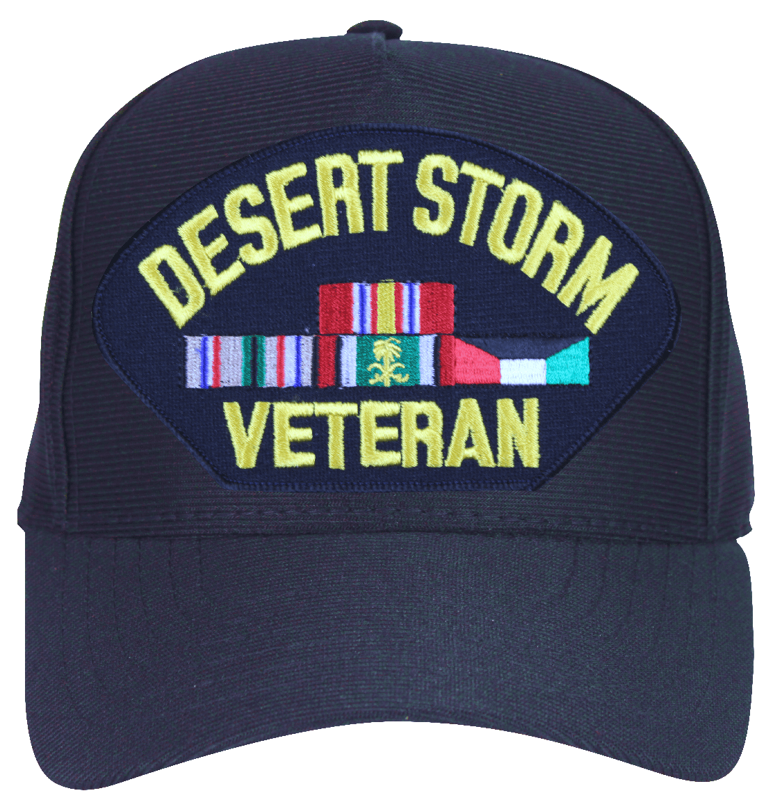 This Desert Storm Veteran with Ribbons Ball Cap is an emblematic, poly, dark under the visor cap. Each has an adjustable strap, and is available as a 5 panel high profile or 6 panel low profile cap. All MilitaryBest caps are fully guaranteed. Some people call them Military Covers or Military Hats. This Military Cap is proudly Made in The U.S.A.For caps ordered with custom embroidered personalized text please allow an additional 3 to 5 days production time. All custom back text will be embroidered in ALL CAPITAL LETTERS. Caps with back text or eggs are non-returnable unless there is a material defect in the cap. If a style is not selected the cap will be made using a high profile style cap as pictured.