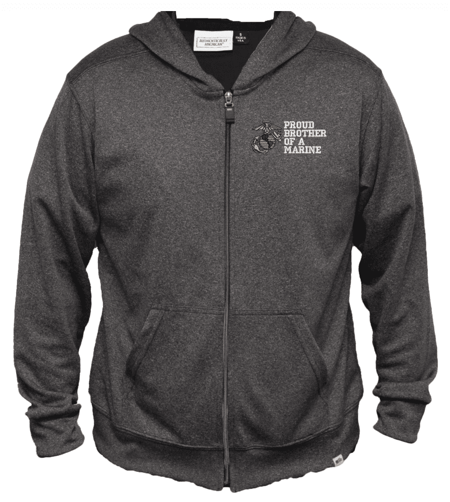 MilitaryBest proudly offers this top-quality Proud Brother of a Marine Men's 100% Polyester Heather Grey Full-Zip Hoodie. We have proudly partnered with Authentically American to offer you this Made in the USA Hoodie. Water & wrinkle resistance make this zip hoodie the perfect layering piece from the golf course to you favorite travel destination.As with all MilitaryBest items, our designs are Officially Licensed. A percentage of the sale of each MilitaryBest item is forwarded to the licensing department in support of it's MWR (Morale, Welfare, & Recreation) program. These payments are made by either ALL4U LLC or the wholesaler from where the item originated. Our team thanks you for your service and your support of these programs.
