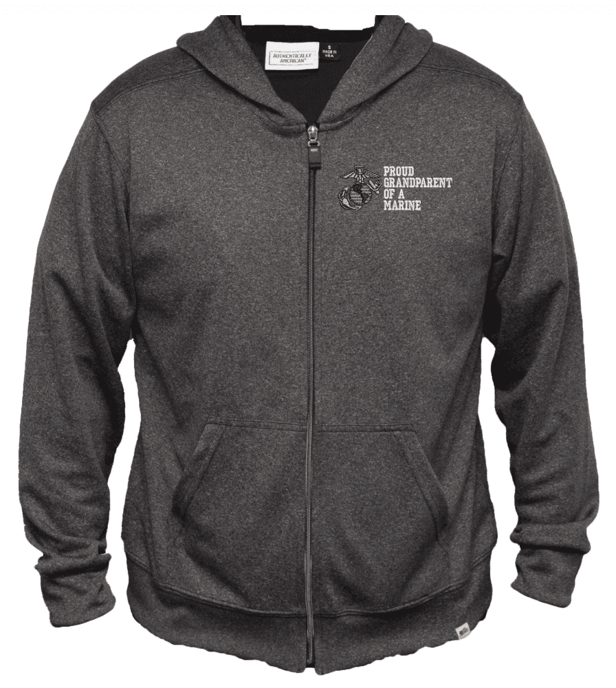 MilitaryBest proudly offers this top-quality Proud GrandParent of a Marine Men's 100% Polyester Heather Grey Full-Zip Hoodie. We have proudly partnered with Authentically American to offer you this Made in the USA Hoodie. Water & wrinkle resistance make this zip hoodie the perfect layering piece from the golf course to you favorite travel destination.As with all MilitaryBest items, our designs are Officially Licensed. A percentage of the sale of each MilitaryBest item is forwarded to the licensing department in support of it's MWR (Morale, Welfare, & Recreation) program. These payments are made by either ALL4U LLC or the wholesaler from where the item originated. Our team thanks you for your service and your support of these programs.