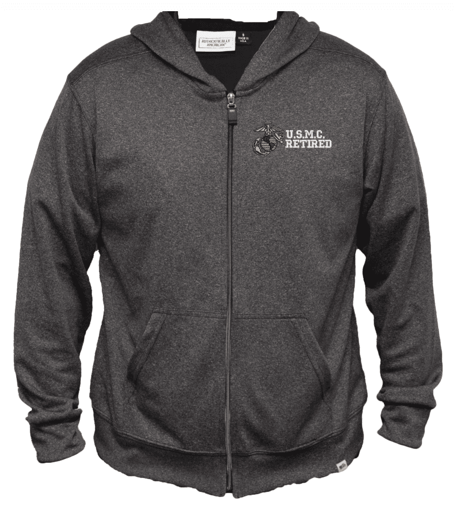 MilitaryBest proudly offers this top-quality U.S. Marine Corps Retired Men's 100% Polyester Heather Grey Full-Zip Hoodie. We have proudly partnered with Authentically American to offer you this Made in the USA Hoodie. Water & wrinkle resistance make this zip hoodie the perfect layering piece from the golf course to you favorite travel destination.