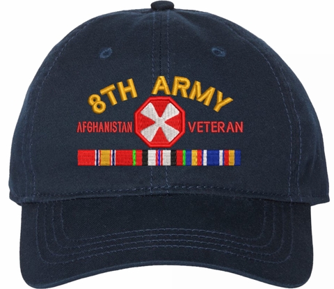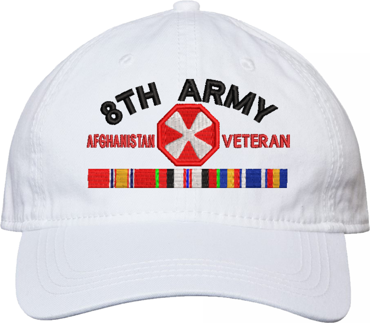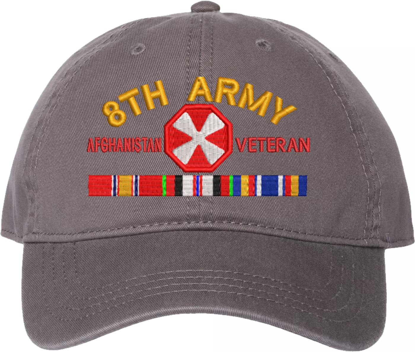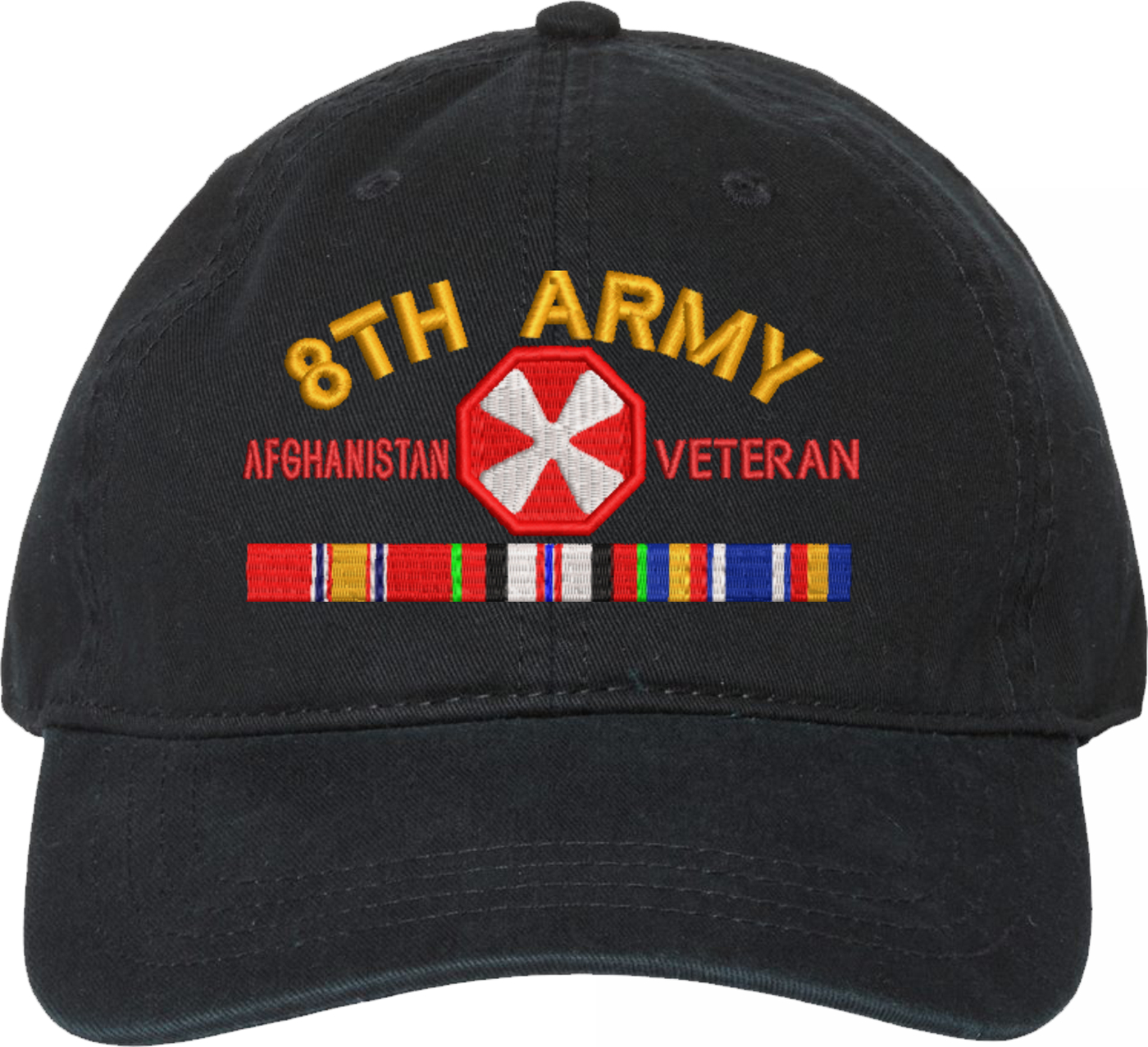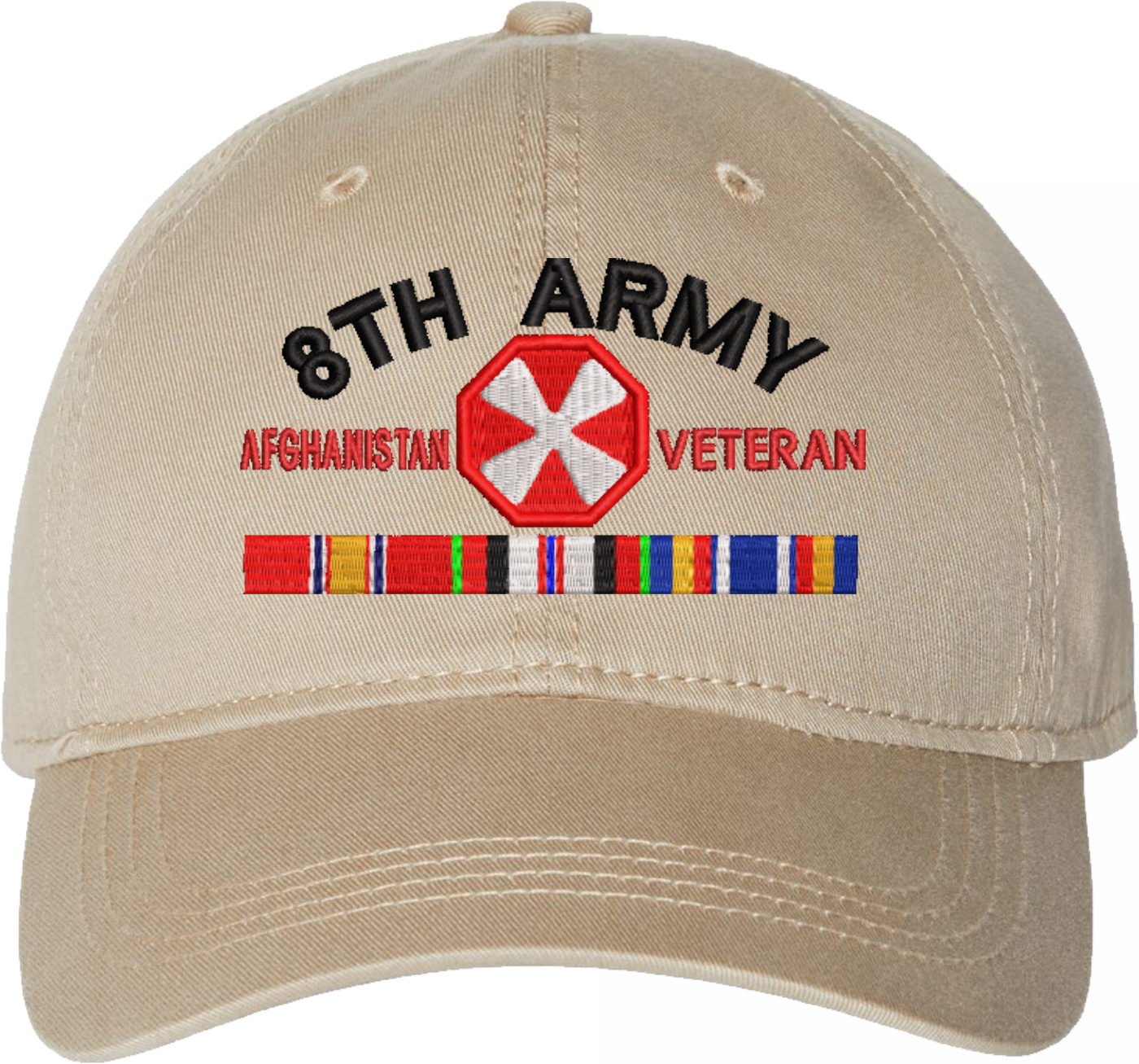 Show your Army pride with this Eighth Army Afghanistan Veteran with Ribbons Unstructured Dad Cap from MilitaryBest. Crafted from 100% washed chino twill cotton, this six-panel, low-profile cap offers a relaxed and comfortable fit. Featuring high-quality embroidery done in our Scottsboro, Alabama facility, this cap is designed with a pre-curved visor and an adjustable tri-glide buckle closure for a perfect fit. Whether for everyday wear or as a meaningful gift, this cap is a great way to honor your own or a loved one's service.For caps ordered with custom embroidered personalized text please allow an additional 3 to 5 days production time. All custom back text will be embroidered in ALL CAPITAL LETTERS. Caps with back text or eggs are non-returnable unless there is a material defect in the cap.