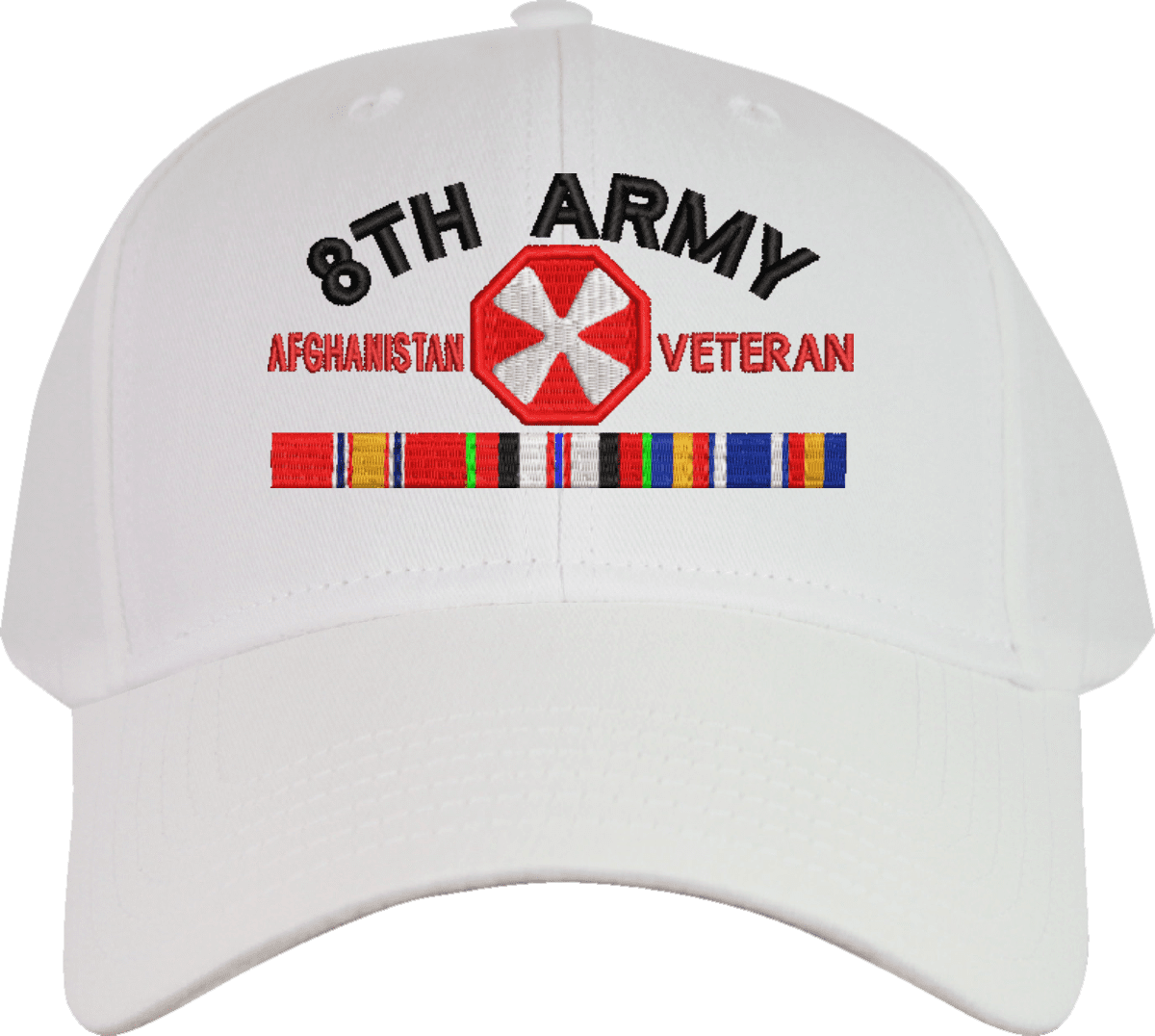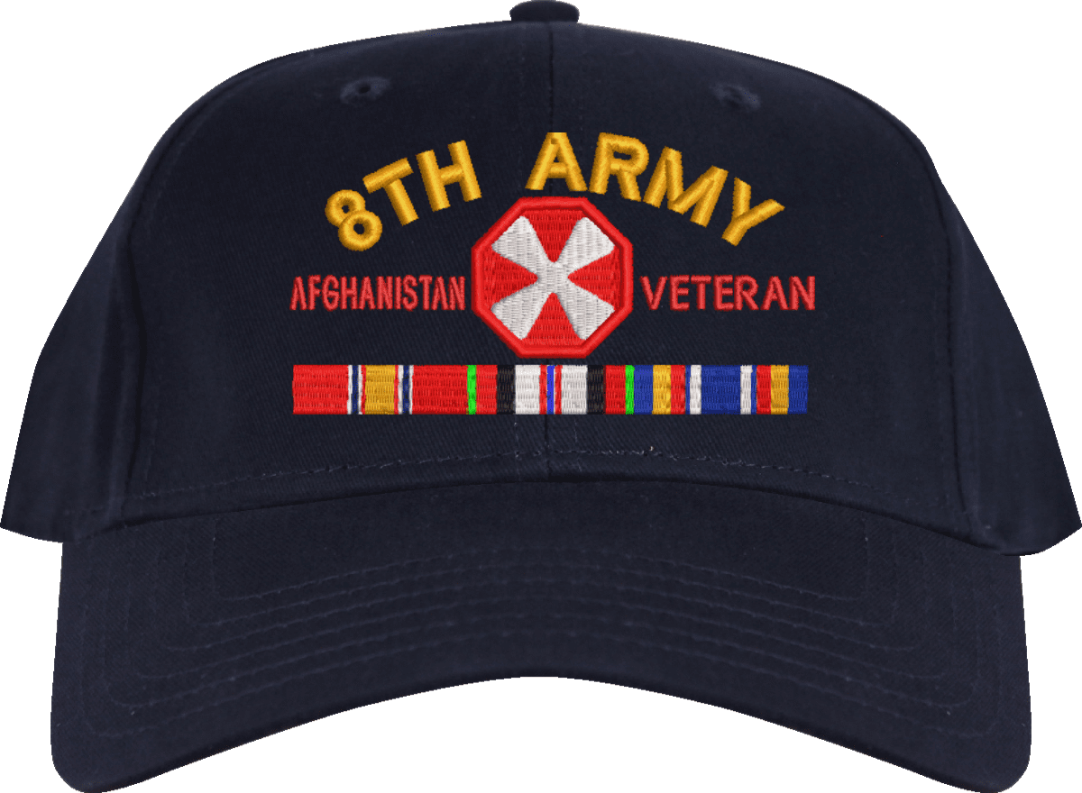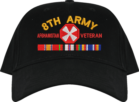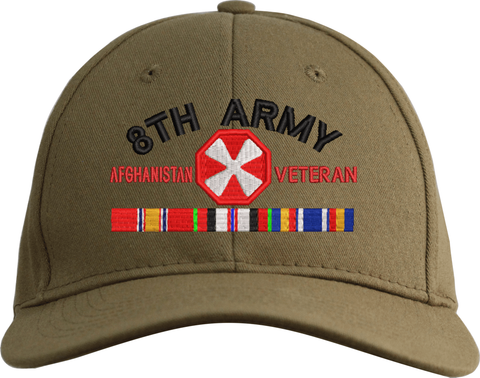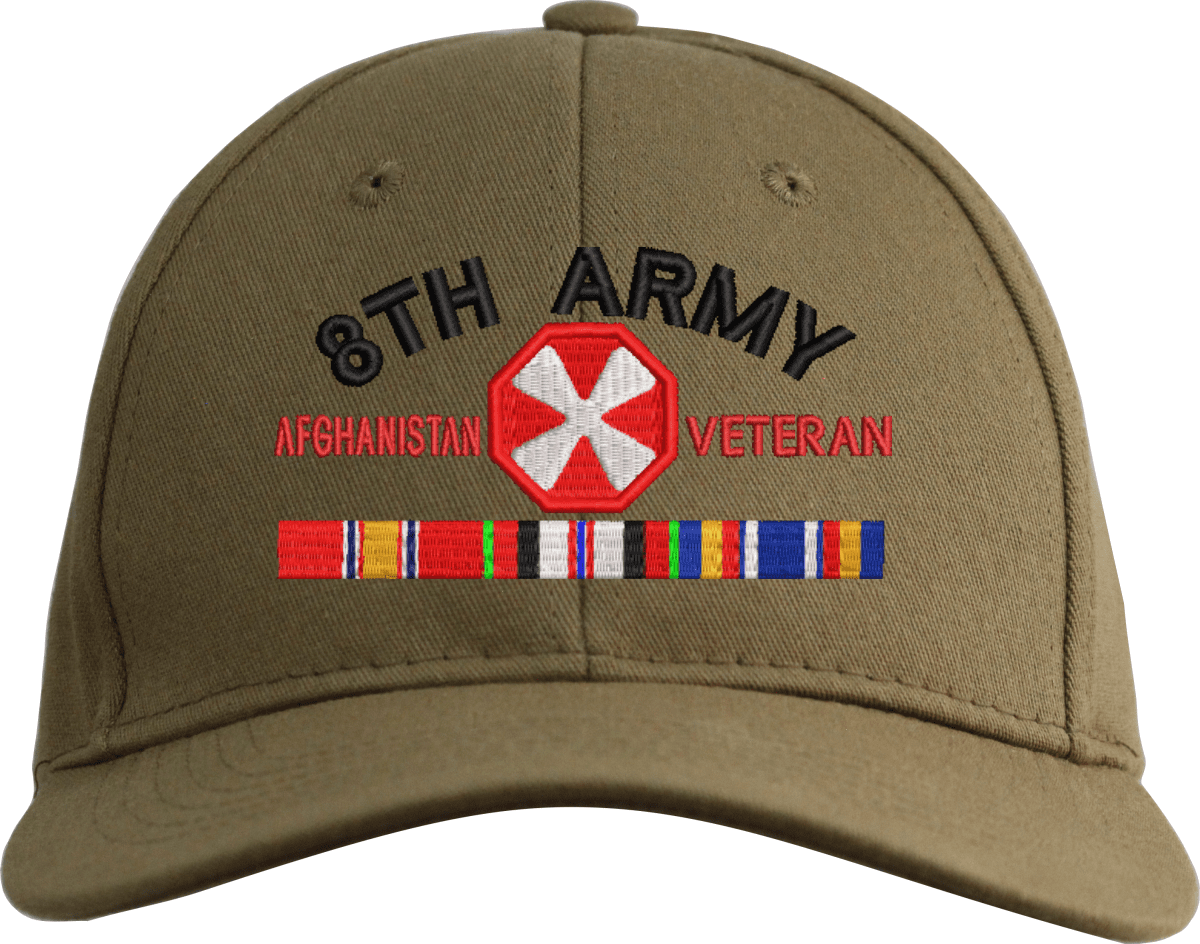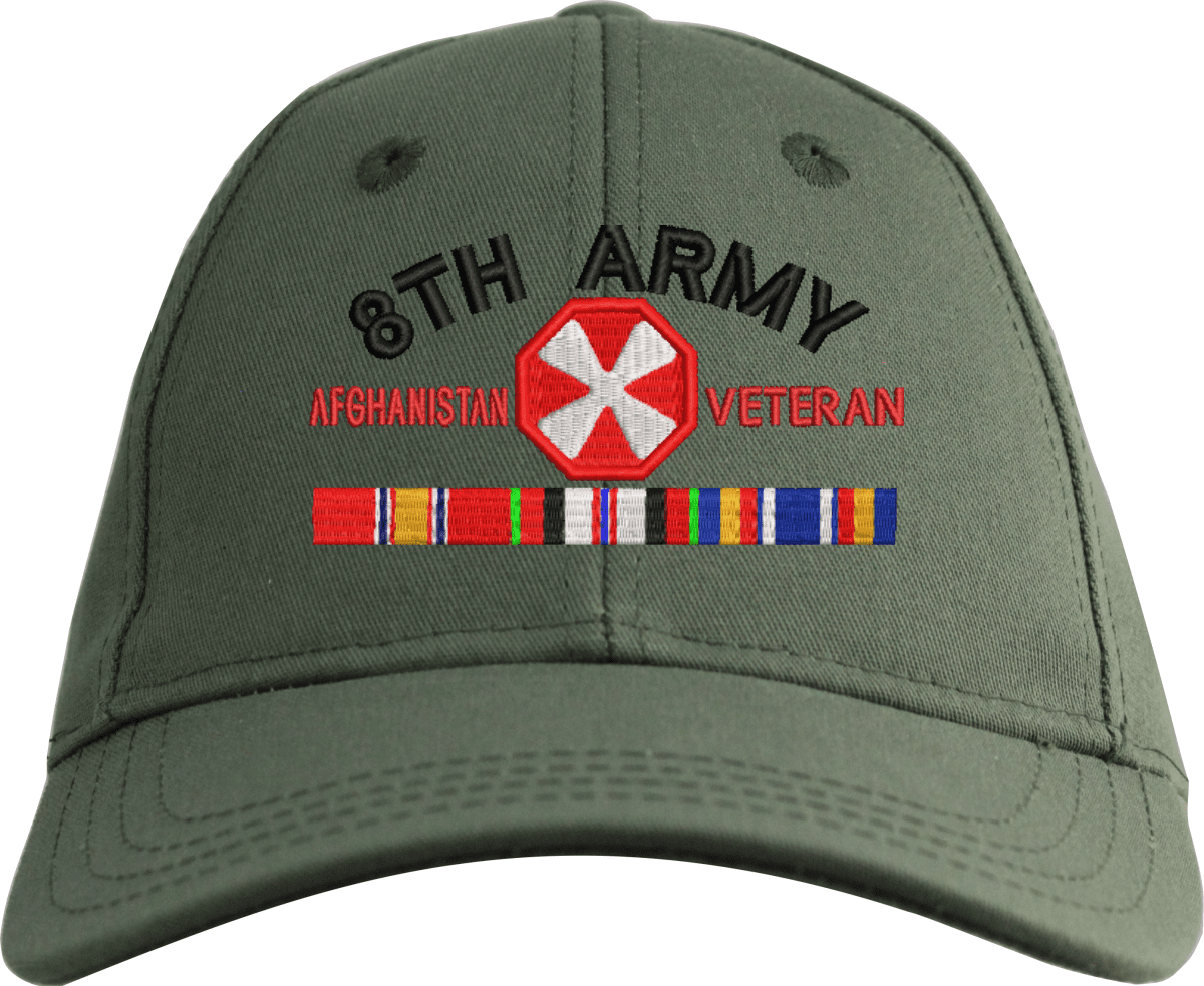MilitaryBest is proud to offer this Eighth Army Afghanistan Veteran Embroidered Cap with Ribbons. This cap is available in a 5 panel high profile or 6 panel low profile styling. All our caps are made from top quality materials. This cap would make a wonderful addition to your collection or a great gift! All custom embroidery is done at our facility in Scottsboro, AL.