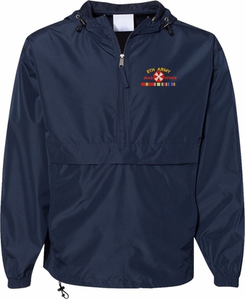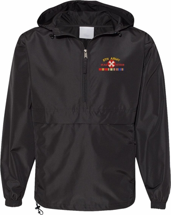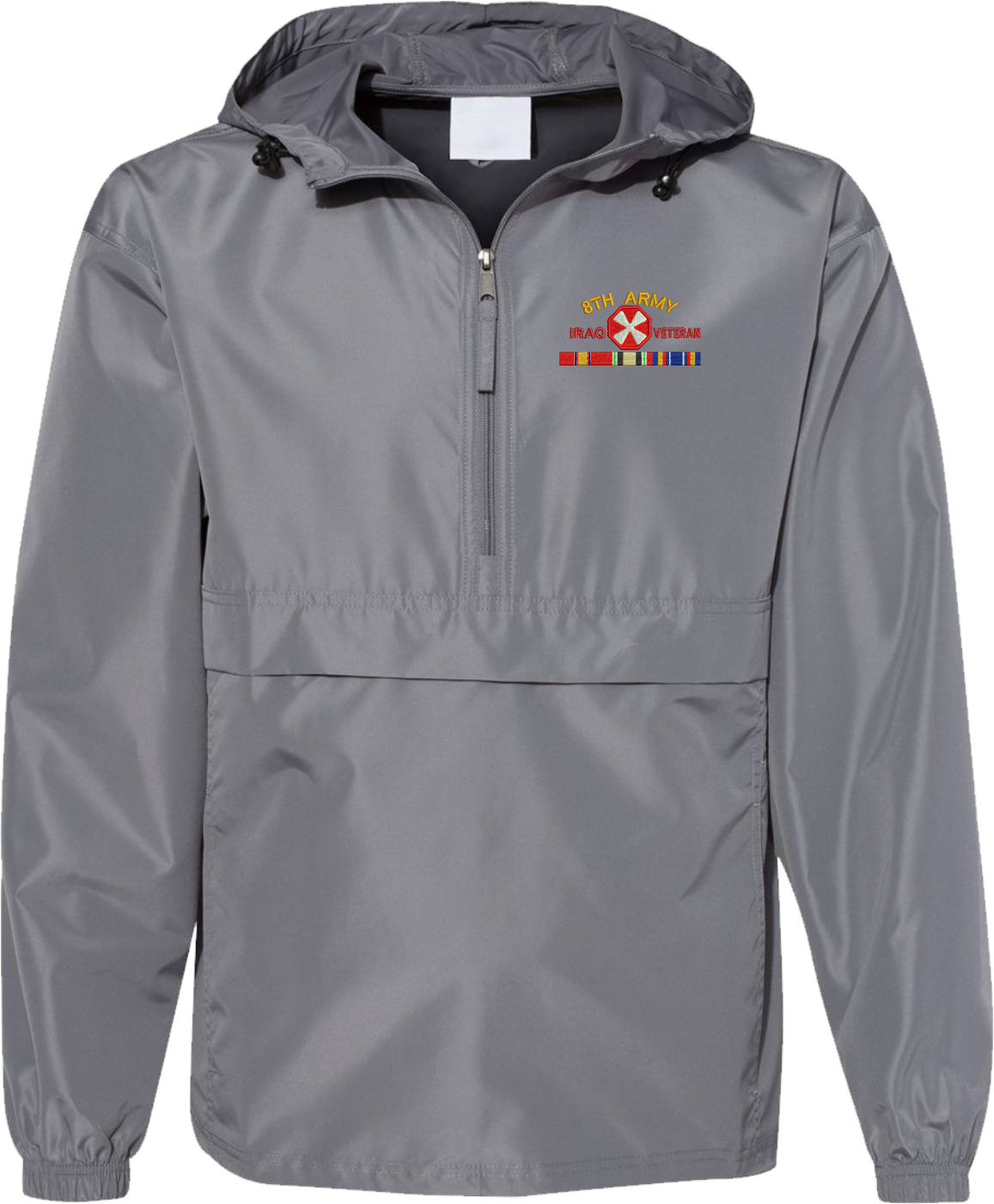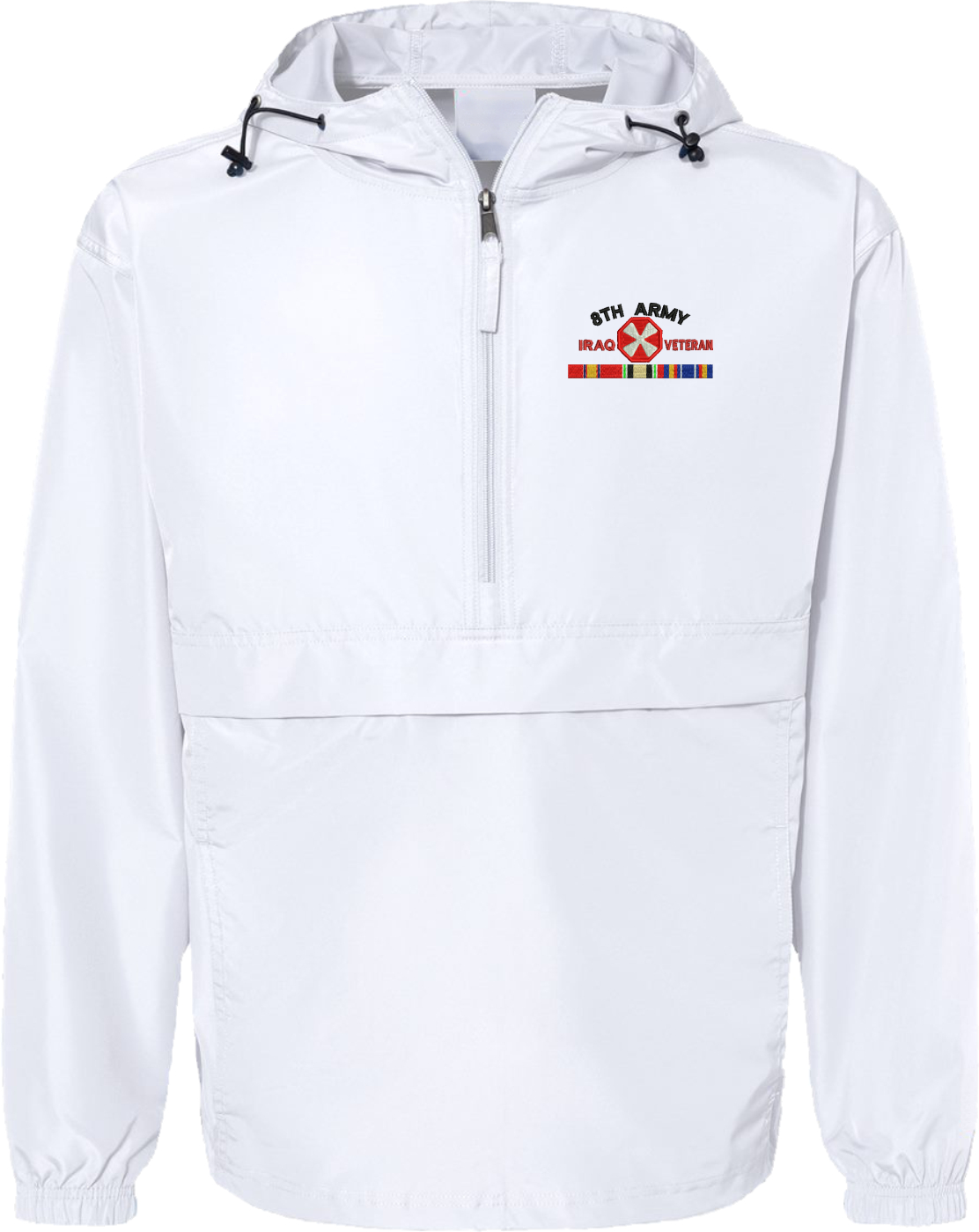 MilitaryBest is proud to offer this quality Eighth Army Iraq Veteran with Ribbons Hooded Windbreaker. Also known as an Anorak Jacket, this windbreaker is designed to keep wind and water out. With a design embroidered over the left chest, this windbreaker is embroidered to order at our facilities in Scottsboro, AL.. This windbreaker can be packed into the mesh lined pouch pocket for a more portable method of storage.- 100% Polyester