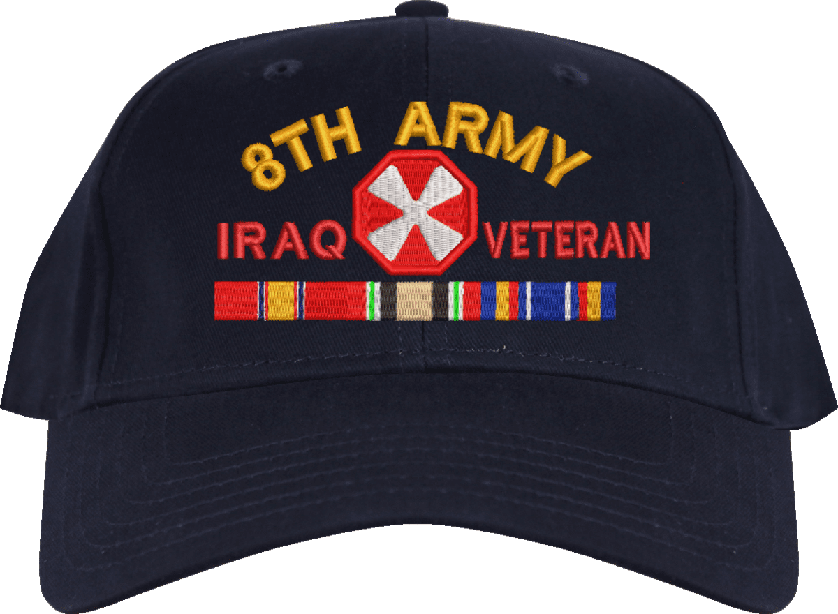 MilitaryBest is proud to offer this Eighth Army Iraq Veteran Embroidered Cap with Ribbons. This cap is available in a 5 panel high profile or 6 panel low profile styling. All our caps are made from top quality materials. This cap would make a wonderful addition to your collection or a great gift! All custom embroidery is done at our facility in Scottsboro, AL.