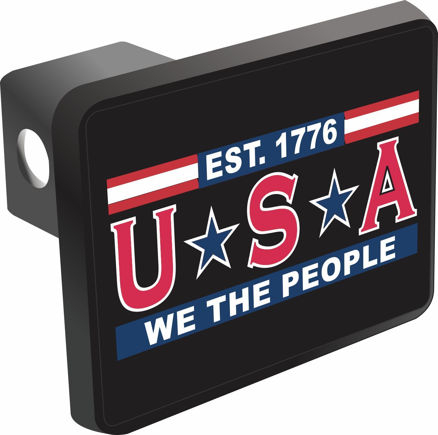 This Est 1776 "We The People" Hitch Cover is proudly Made in the USA. Each Hitch Cover's face plate measures 4.7" x 3.4" and is applied on a black heavy duty injection molded plastic 2" hitch cover; link pin not included. The face plate of the hitch cover is sublimation printed to provide a beautiful glossy finish sure to catch the eye. This hitch cover would make a wonderful addition to your truck or other vehicle.A percentage of the sale of each MilitaryBest item is forwarded to the licensing departments of each respective branch of service in support of the MWR (Morale, Welfare, & Recreation) program. These payments are made by either ALL4U LLC or the wholesaler from where the item originated. Our team thanks you for your service and your support of these programs.