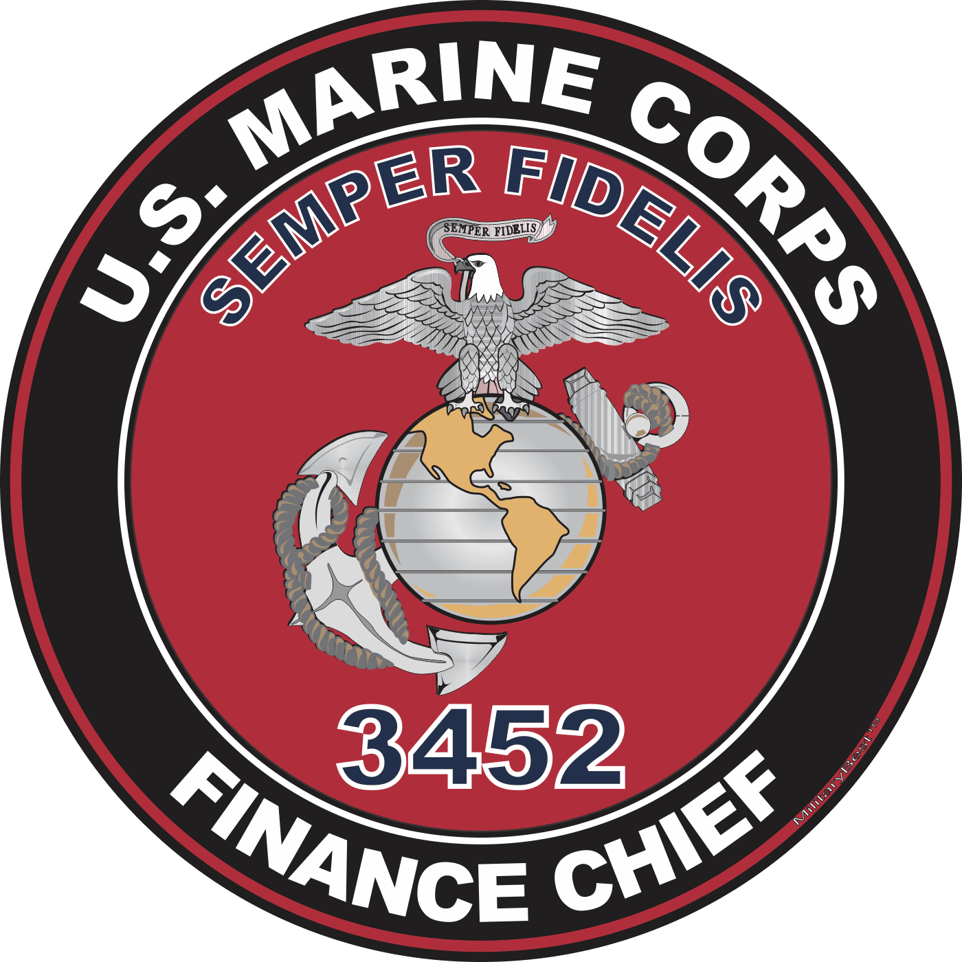 MilitaryBest is proud to offer this U.S.M.C. MOS 3452 Finance Chief Decal. This U.S. Marine Corps MOS Decal is a great way to show your Marine Pride. All MilitaryBest Marine Corps stickers are printed using high-quality vinyl and U.V. resistant ink. Each is then cured, laminated and die cut for a beautiful crisp, clean and professional look. This U.S.M.C. MOS 3452 Finance Chief Decal, as well as, any other MilitaryBest.com decal is proudly Made in the USA at our facilities in Scottsboro, AL. Select desired quantity and size from the menu above.Features: