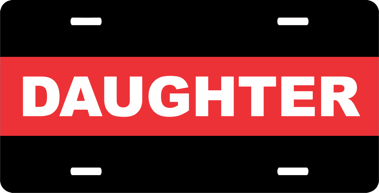 This Firefighter Thin Red Line Daughter License Plate is made from heavy gauge aluminum and has a baked enamel finish to last for many years of use. Each plate measures 5 15/16" x 11 15/16". This license plate would make a wonderful addition to your collection or a great gift.
