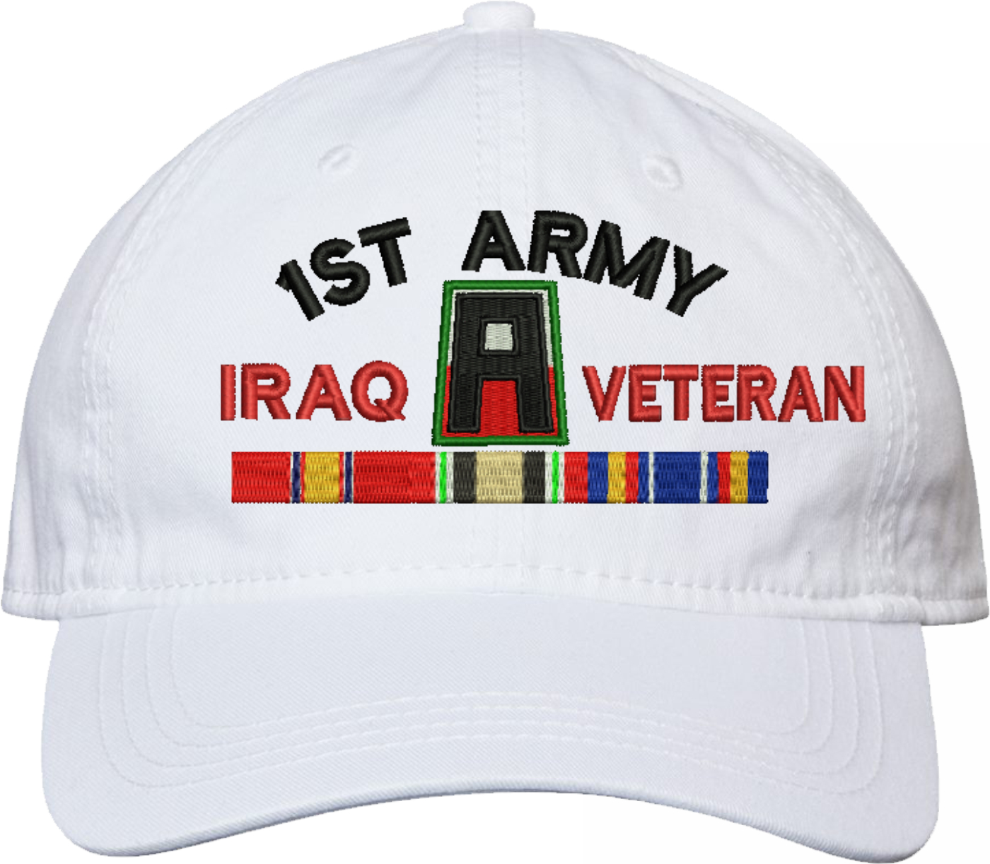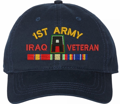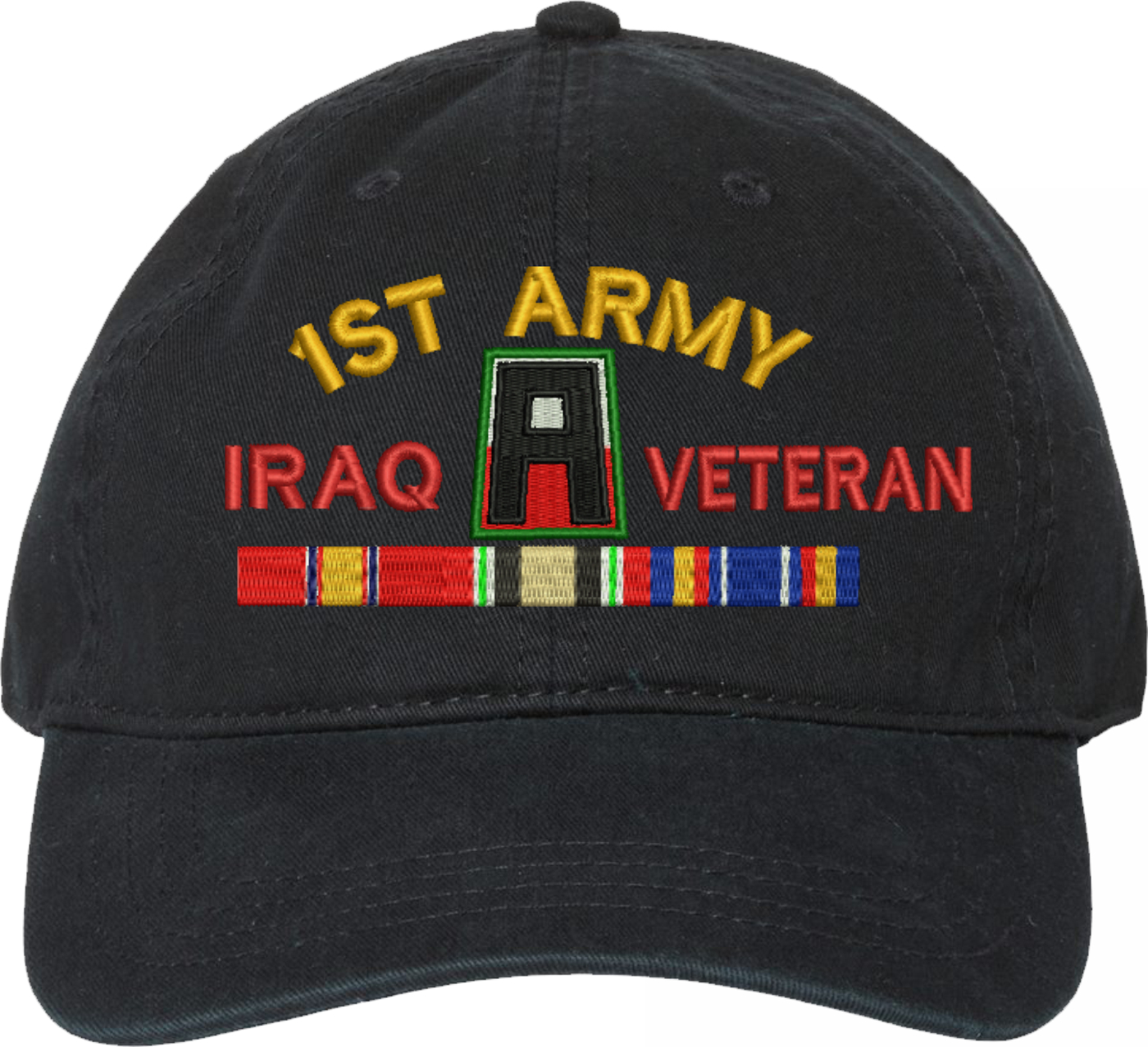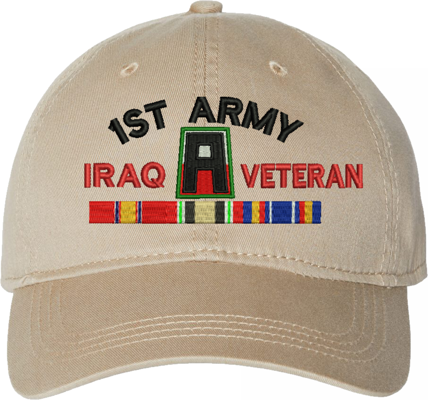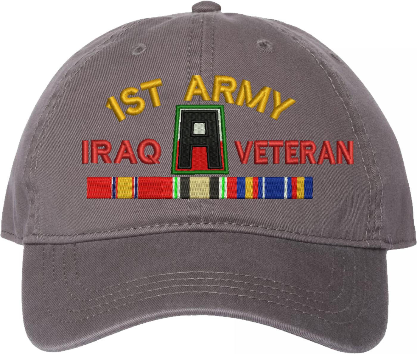 Show your Army pride with this First Army Iraq Veteran with Ribbons Unstructured Dad Cap from MilitaryBest. Crafted from 100% washed chino twill cotton, this six-panel, low-profile cap offers a relaxed and comfortable fit. Featuring high-quality embroidery done in our Scottsboro, Alabama facility, this cap is designed with a pre-curved visor and an adjustable tri-glide buckle closure for a perfect fit. Whether for everyday wear or as a meaningful gift, this cap is a great way to honor your own or a loved one's service.For caps ordered with custom embroidered personalized text please allow an additional 3 to 5 days production time. All custom back text will be embroidered in ALL CAPITAL LETTERS. Caps with back text or eggs are non-returnable unless there is a material defect in the cap.
