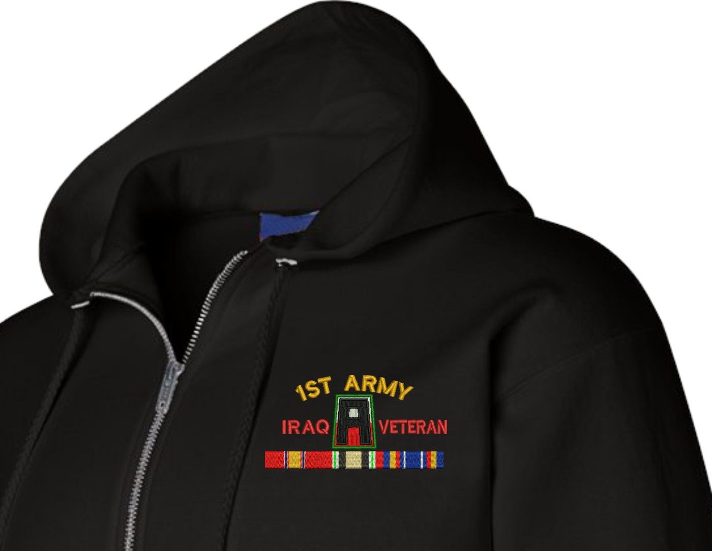 MilitaryBest has expanded its line of apparel with this custom embroidered U.S. Army First Army Iraq Veteran with Ribbons Embroidered Zippered Hoodie. Each Hoodie is direct embroidered onto a Champion brand 9.5 oz 50/50 Cotton Poly blend. This will make an excellent addition to your wardrobe, or a great gift. Your satisfaction is Guaranteed! These quality zippered hoodies are proudly embroidered at our facilities in Scottsboro, AL. Support the Army MWR program by purchasing only from Licensed Vendors.