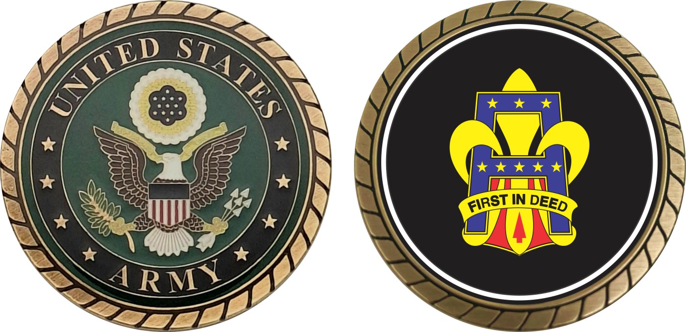 This 1 3/4” First U.S. Army Unit Crest Challenge Coin is proudly offered by Militarybest. This Officially Licensed Army coin has beautiful enamel finish on one side and an organized crisp clean design on the opposite side.