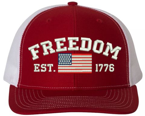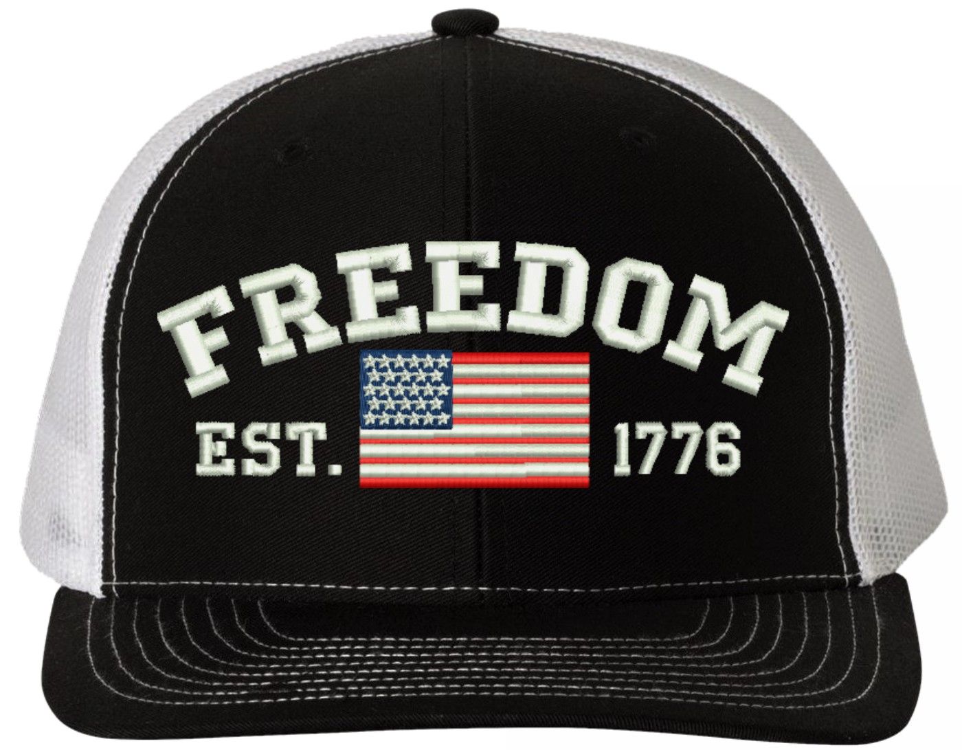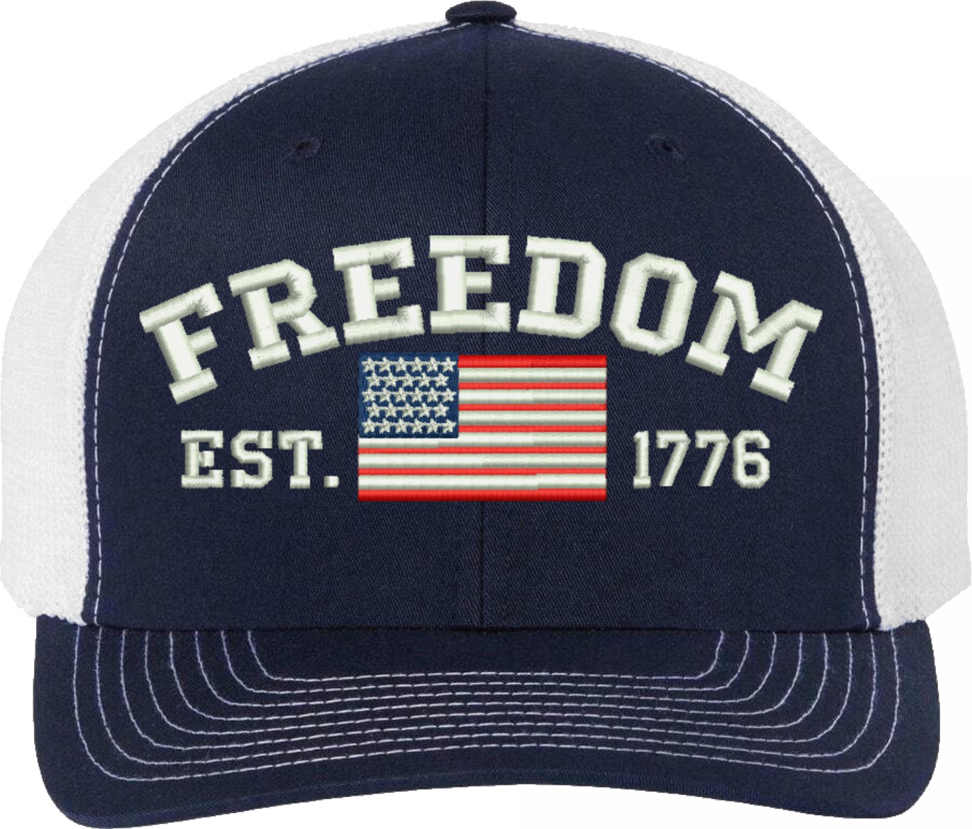 Celebrate 250 Years of the United States of America! MilitaryBest is proud to offer this Freedom Est 1776 Embroidered Mesh-Back Cap. This Mesh-Back Cap is expertly crafted by our skilled embroidery technicians at our facilities in Scottsboro, Alabama. As with all MilitaryBest items, your satisfaction is guaranteed!For caps ordered with custom embroidered personalized text please allow an additional 3 to 5 days production time. All custom back text will be embroidered in ALL CAPITAL LETTERS. Caps with back text or eggs are non-returnable unless there is a material defect in the cap.
