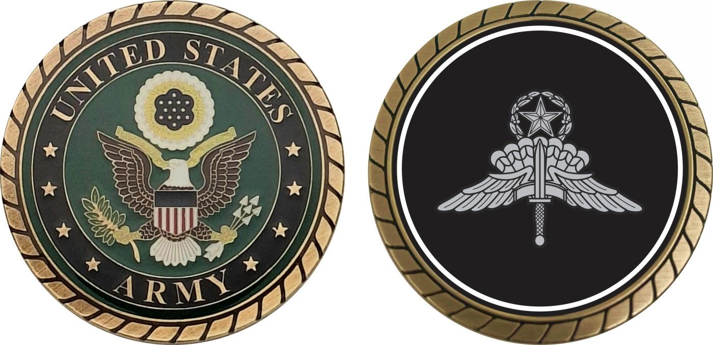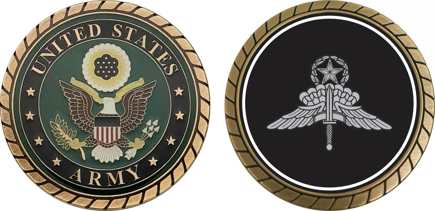 This 1 3/4” HALO Master Parachutist Jump Wings Challenge Coin is proudly offered by Militarybest. This Officially Licensed Army coin has beautiful enamel finish on one side and an organized crisp clean design on the opposite side.