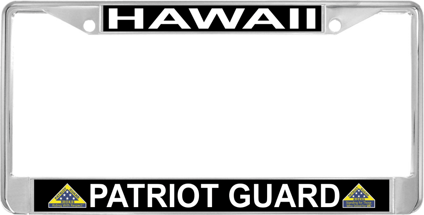 This Hawaii Patriot Guard Automobile License Plate Frame is proudly produced at our facility in Scottsboro, Alabama. Each Chrome Dipped Alloy Frame has Poly Coated Aluminum Inserts which allow our production team to provide you with High Quality Designs. Unfortunately, this frame is not offered as a Motorcycle Frame.Please check with your state and local regulations regarding suitability for displaying this Automobile License Plate Frame on your vehicle since these regulations may have changed in your state. Various weather and road conditions may impact the life span of your frame e.g. salted roads, long exposure to direct sunlight etc.