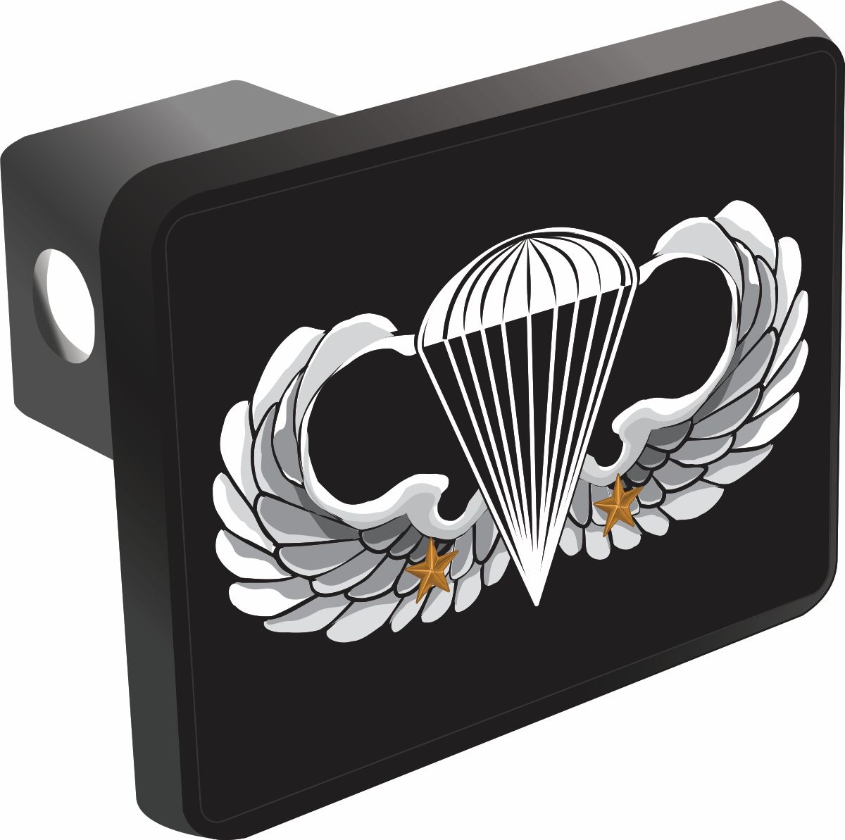 This U.S. Army Basic 2 Combat Jump Wings Trailer Hitch Cover is proudly Made in the USA. Each Hitch Cover's face plate measures 4.7" x 3.4" and is applied on a black heavy duty injection molded plastic 2" hitch cover; link pin not included. The face plate of the hitch cover is sublimation printed to provide a beautiful glossy finish sure to catch the eye. This hitch cover would make a wonderful addition to your truck or other vehicle.A percentage of the sale of each MilitaryBest item is forwarded to the licensing departments of each respective branch of service in support of the MWR (Morale, Welfare, & Recreation) program. These payments are made by either ALL4U LLC or the wholesaler from where the item originated. Our team thanks you for your service and your support of these programs.