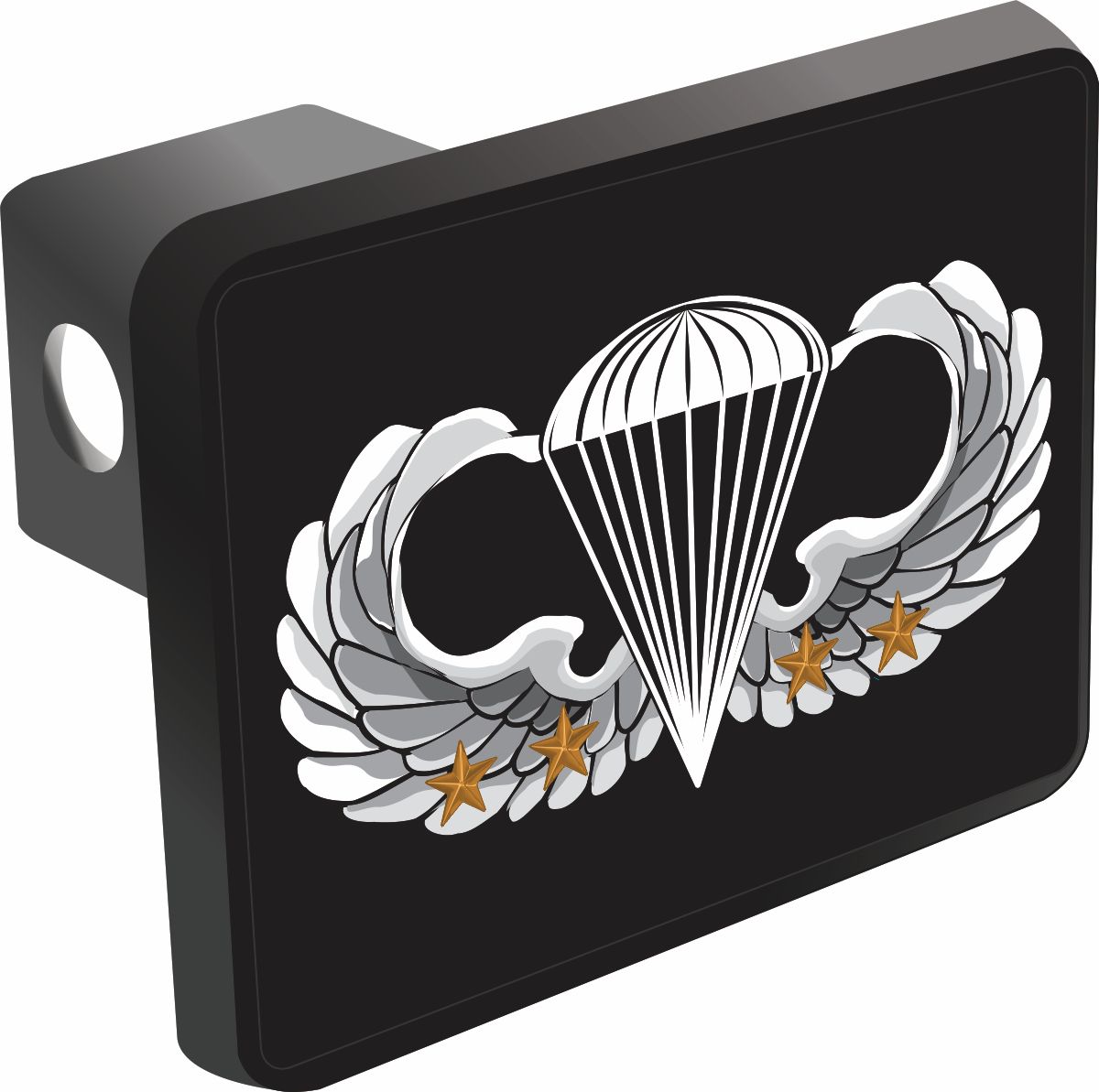 This U.S. Army Basic 4 Combat Jump Wings Trailer Hitch Cover is proudly Made in the USA. Each Hitch Cover's face plate measures 4.7" x 3.4" and is applied on a black heavy duty injection molded plastic 2" hitch cover; link pin not included. The face plate of the hitch cover is sublimation printed to provide a beautiful glossy finish sure to catch the eye. This hitch cover would make a wonderful addition to your truck or other vehicle.A percentage of the sale of each MilitaryBest item is forwarded to the licensing departments of each respective branch of service in support of the MWR (Morale, Welfare, & Recreation) program. These payments are made by either ALL4U LLC or the wholesaler from where the item originated. Our team thanks you for your service and your support of these programs.