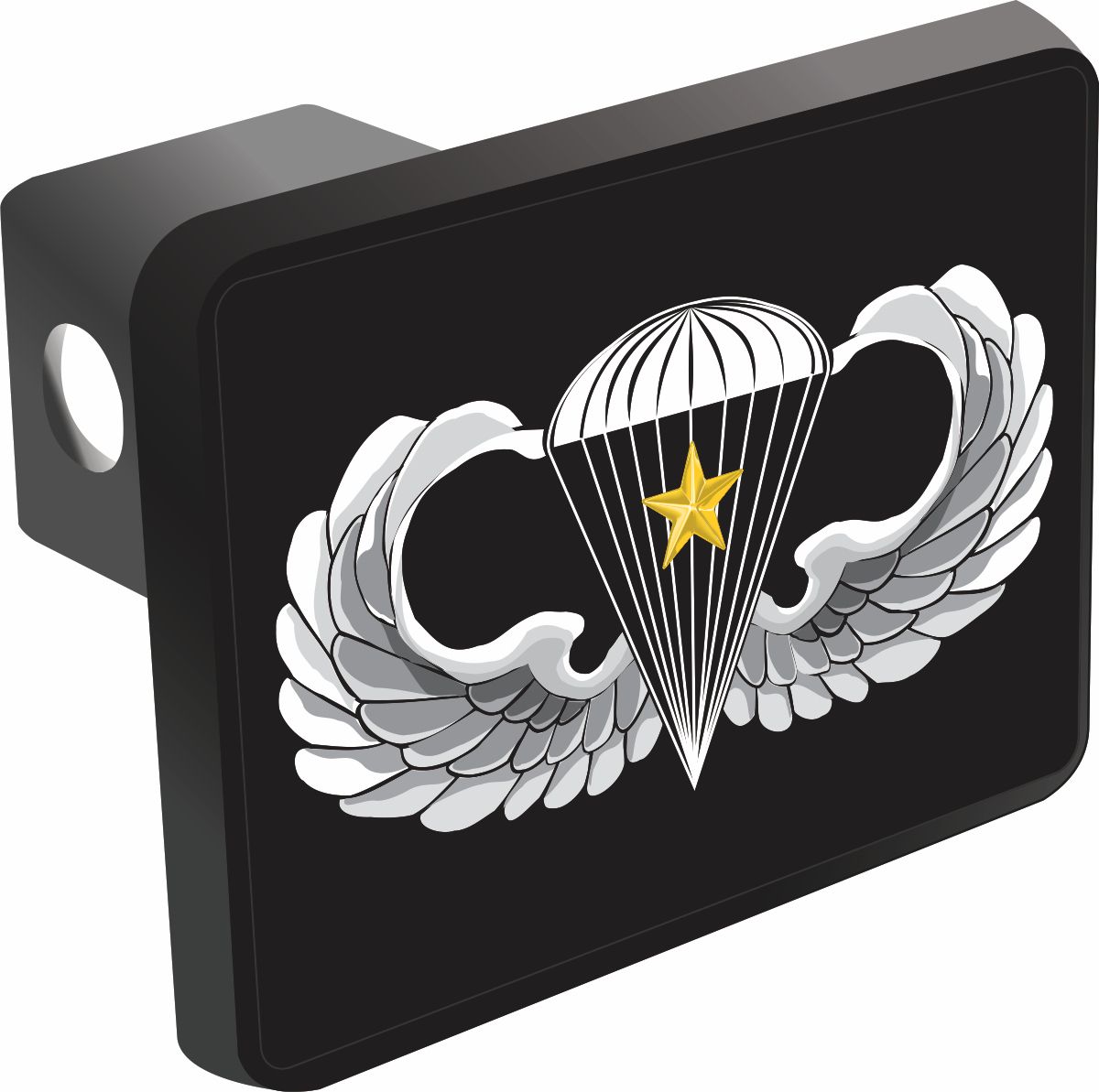 This U.S. Army Basic 5 Combat Jump Wings Trailer Hitch Cover is proudly Made in the USA. Each Hitch Cover's face plate measures 4.7" x 3.4" and is applied on a black heavy duty injection molded plastic 2" hitch cover; link pin not included. The face plate of the hitch cover is sublimation printed to provide a beautiful glossy finish sure to catch the eye. This hitch cover would make a wonderful addition to your truck or other vehicle.A percentage of the sale of each MilitaryBest item is forwarded to the licensing departments of each respective branch of service in support of the MWR (Morale, Welfare, & Recreation) program. These payments are made by either ALL4U LLC or the wholesaler from where the item originated. Our team thanks you for your service and your support of these programs.