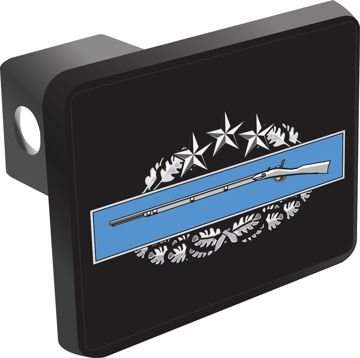 This U.S. Army Combat Infantry Badge (CIB) 4th Award Trailer Hitch Cover is proudly Made in the USA. Each Hitch Cover's face plate measures 4.7" x 3.4" and is applied on a black heavy duty injection molded plastic 2" hitch cover; link pin not included. The face plate of the hitch cover is sublimation printed to provide a beautiful glossy finish sure to catch the eye. This hitch cover would make a wonderful addition to your truck or other vehicle.A percentage of the sale of each MilitaryBest item is forwarded to the licensing departments of each respective branch of service in support of the MWR (Morale, Welfare, & Recreation) program. These payments are made by either ALL4U LLC or the wholesaler from where the item originated. Our team thanks you for your service and your support of these programs.