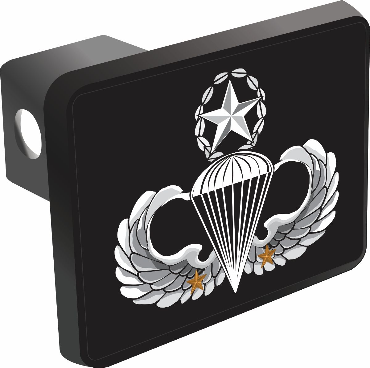 This U.S. Army Master 2 Combat Jump Wings Trailer Hitch Cover is proudly Made in the USA. Each Hitch Cover's face plate measures 4.7" x 3.4" and is applied on a black heavy duty injection molded plastic 2" hitch cover; link pin not included. The face plate of the hitch cover is sublimation printed to provide a beautiful glossy finish sure to catch the eye. This hitch cover would make a wonderful addition to your truck or other vehicle.A percentage of the sale of each MilitaryBest item is forwarded to the licensing departments of each respective branch of service in support of the MWR (Morale, Welfare, & Recreation) program. These payments are made by either ALL4U LLC or the wholesaler from where the item originated. Our team thanks you for your service and your support of these programs.