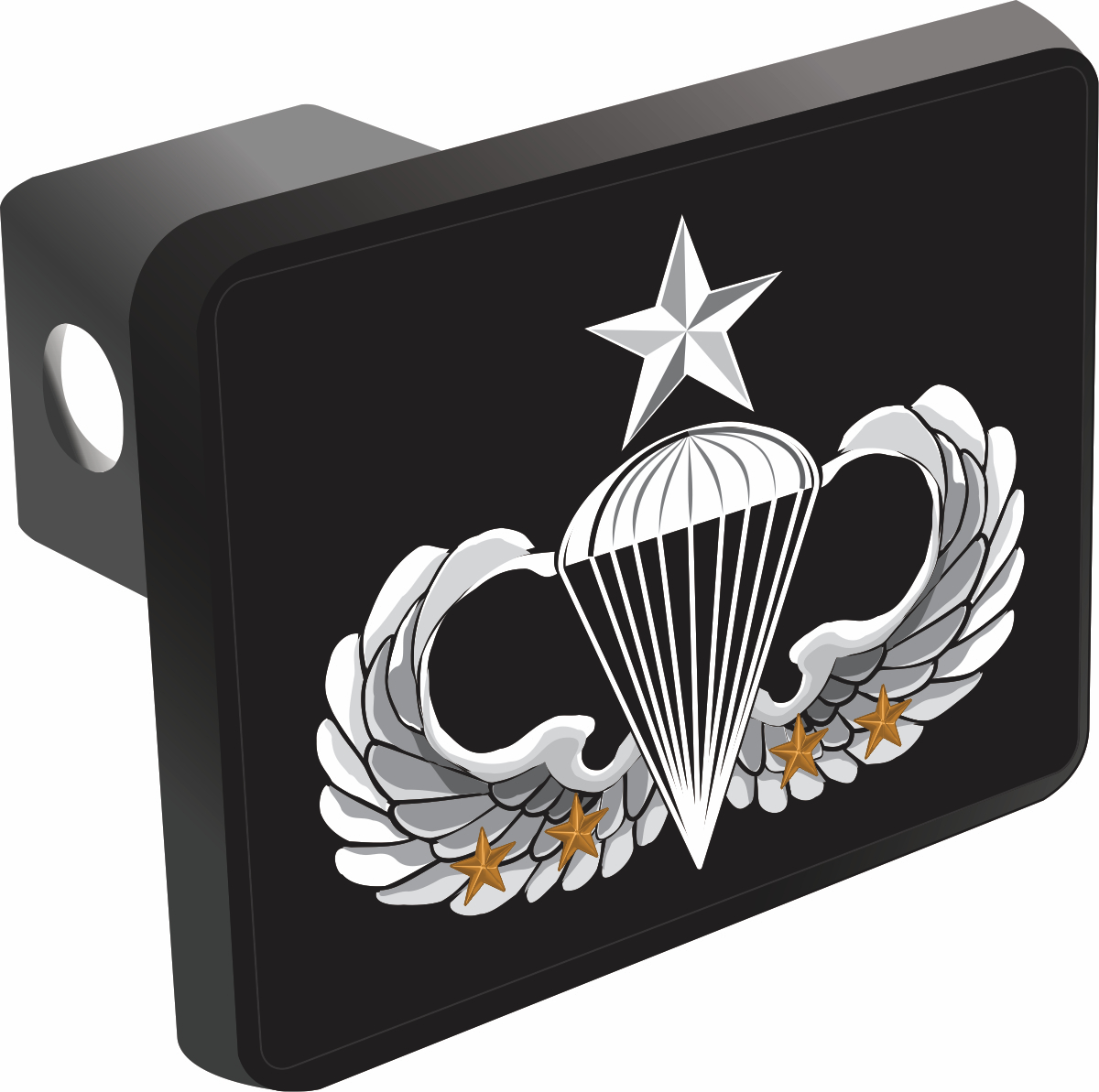 This U.S. Army Senior 4 Combat Jump Wings Trailer Hitch Cover is proudly Made in the USA. Each Hitch Cover's face plate measures 4.7" x 3.4" and is applied on a black heavy duty injection molded plastic 2" hitch cover; link pin not included. The face plate of the hitch cover is sublimation printed to provide a beautiful glossy finish sure to catch the eye. This hitch cover would make a wonderful addition to your truck or other vehicle.A percentage of the sale of each MilitaryBest item is forwarded to the licensing departments of each respective branch of service in support of the MWR (Morale, Welfare, & Recreation) program. These payments are made by either ALL4U LLC or the wholesaler from where the item originated. Our team thanks you for your service and your support of these programs.