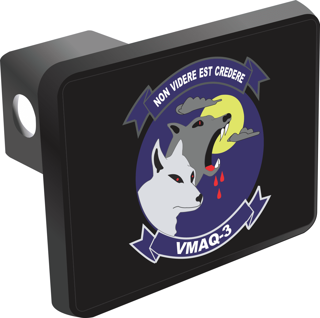 This U.S. Marine Corps Marine Tactical Electronic Warfare Squadron VMAQ-3 Hitch Cover is proudly Made in the USA. Each Hitch Cover's face plate measures 4.7" x 3.4" and is applied on a black heavy duty injection molded plastic 2" hitch cover; link pin not included. The face plate of the hitch cover is sublimation printed to provide a beautiful glossy finish sure to catch the eye. This hitch cover would make a wonderful addition to your truck or other vehicle.A percentage of the sale of each MilitaryBest item is forwarded to the licensing departments of each respective branch of service in support of the MWR (Morale, Welfare, & Recreation) program. These payments are made by either ALL4U LLC or the wholesaler from where the item originated. Our team thanks you for your service and your support of these programs.