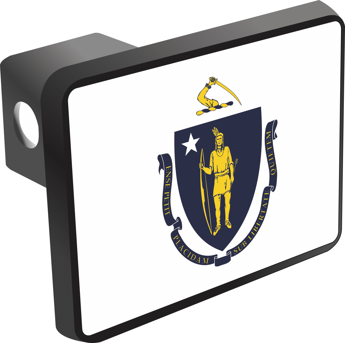This Massachusetts State Flag Hitch Cover is proudly Made in the USA. Each Hitch Cover's face plate measures 4.7" x 3.4" and is applied on a black heavy duty injection molded plastic 2" hitch cover; link pin not included. The face plate of the hitch cover is sublimation printed to provide a beautiful glossy finish sure to catch the eye. This hitch cover would make a wonderful addition to your truck or other vehicle.A percentage of the sale of each MilitaryBest item is forwarded to the licensing departments of each respective branch of service in support of the MWR (Morale, Welfare, & Recreation) program. These payments are made by either ALL4U LLC or the wholesaler from where the item originated. Our team thanks you for your service and your support of these programs.