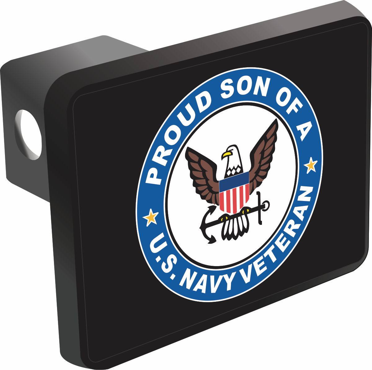 This Proud Son of a U.S. Navy Veteran Trailer Hitch Cover is proudly Made in the USA. Each Hitch Cover's face plate measures 4.7" x 3.4" and is applied on a black heavy duty injection molded plastic 2" hitch cover; link pin not included. The face plate of the hitch cover is sublimation printed to provide a beautiful glossy finish sure to catch the eye. This hitch cover would make a wonderful addition to your truck or other vehicle.A percentage of the sale of each MilitaryBest item is forwarded to the licensing departments of each respective branch of service in support of the MWR (Morale, Welfare, & Recreation) program. These payments are made by either ALL4U LLC or the wholesaler from where the item originated. Our team thanks you for your service and your support of these programs.