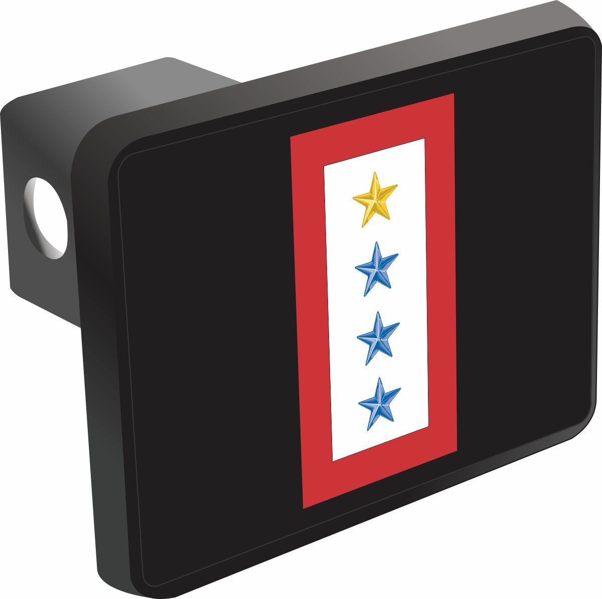 This One Gold Star Three Blue Stars Flag Trailer Hitch Cover is proudly Made in the USA. Each Hitch Cover's face plate measures 4.7" x 3.4" and is applied on a black heavy duty injection molded plastic 2" hitch cover; link pin not included. The face plate of the hitch cover is sublimation printed to provide a beautiful glossy finish sure to catch the eye. This hitch cover would make a wonderful addition to your truck or other vehicle.A percentage of the sale of each MilitaryBest item is forwarded to the licensing departments of each respective branch of service in support of the MWR (Morale, Welfare, & Recreation) program. These payments are made by either ALL4U LLC or the wholesaler from where the item originated. Our team thanks you for your service and your support of these programs.