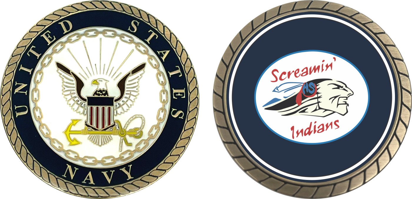 This 1 3/4” HS Screamin Indians Challenge Coin is proudly offered by Militarybest. This Officially Licensed Navy coin has beautiful enamel finish on one side and an organized crisp clean design on the opposite side.
