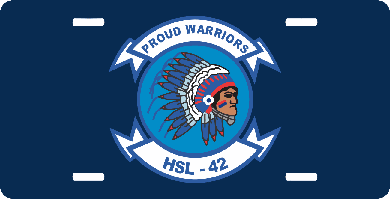 This HSL-42 Proud Warriors License Plate is made from heavy gauge aluminum and has a baked enamel finish to last for many years of use. Each plate measures 5 15/16" x 11 15/16". This license plate would make a wonderful addition to your collection or a great gift.