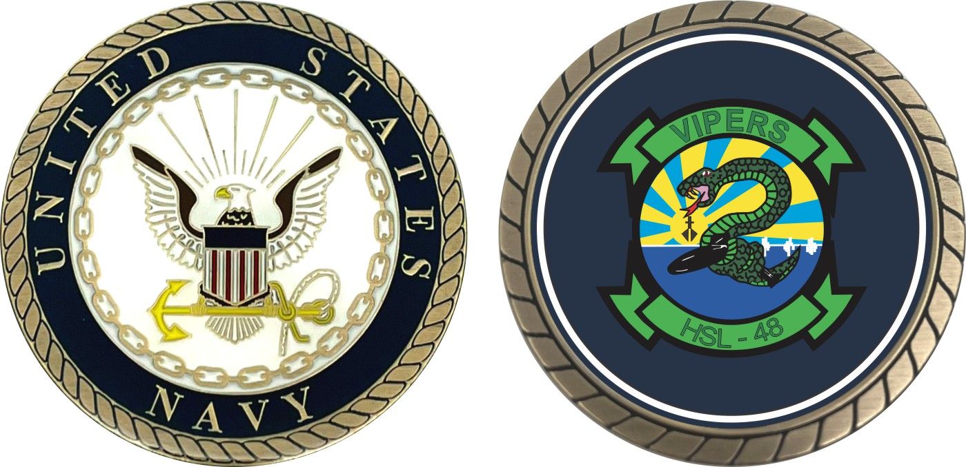 This 1 3/4” HSL-48 'Vipers' Patch Challenge Coin is proudly offered by Militarybest. This Officially Licensed Navy coin has beautiful enamel finish on one side and an organized crisp clean design on the opposite side.