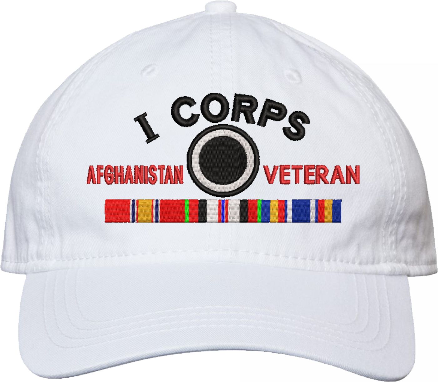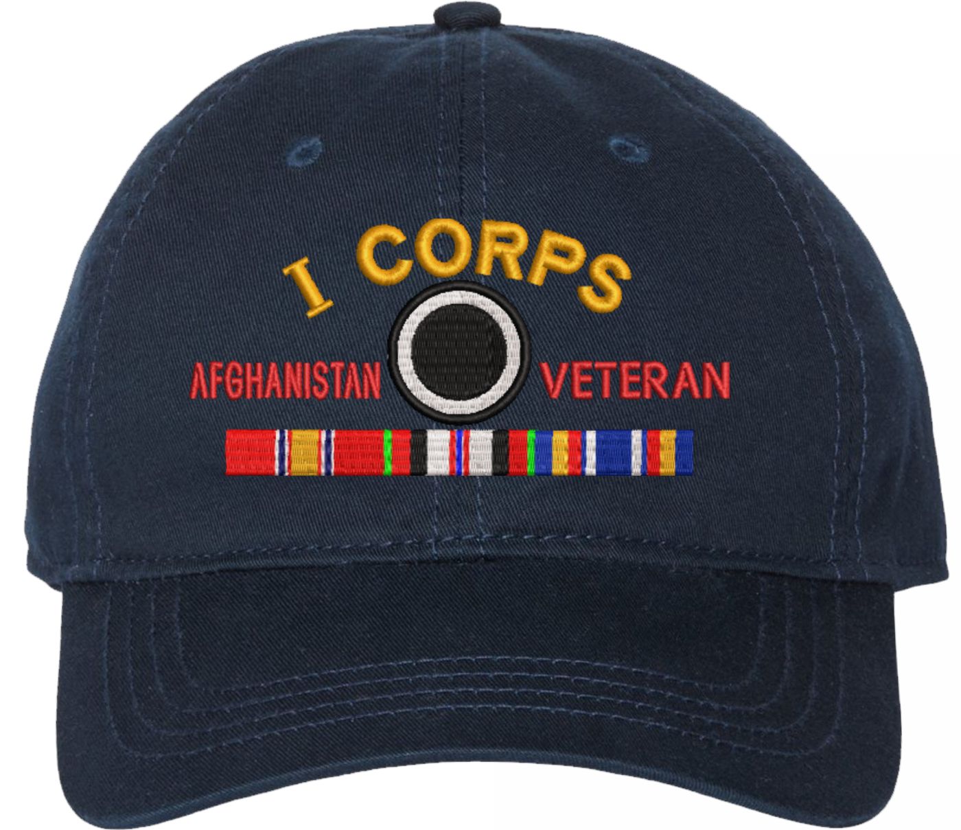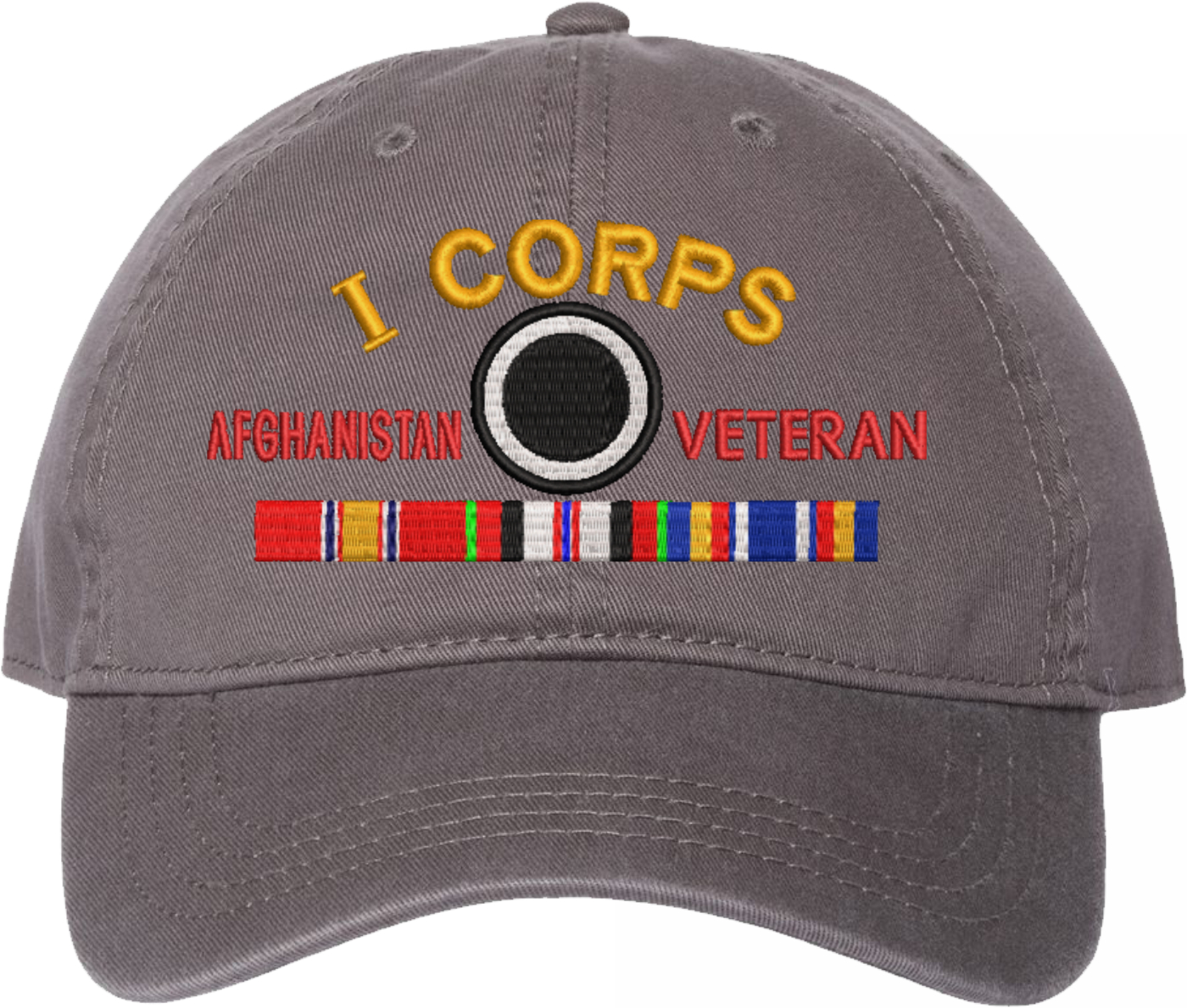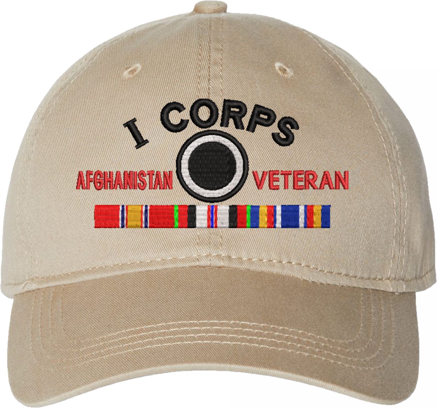 Show your Army pride with this I Corps Afghanistan Veteran with Ribbons Unstructured Dad Cap from MilitaryBest. Crafted from 100% washed chino twill cotton, this six-panel, low-profile cap offers a relaxed and comfortable fit. Featuring high-quality embroidery done in our Scottsboro, Alabama facility, this cap is designed with a pre-curved visor and an adjustable tri-glide buckle closure for a perfect fit. Whether for everyday wear or as a meaningful gift, this cap is a great way to honor your own or a loved one's service.For caps ordered with custom embroidered personalized text please allow an additional 3 to 5 days production time. All custom back text will be embroidered in ALL CAPITAL LETTERS. Caps with back text or eggs are non-returnable unless there is a material defect in the cap.