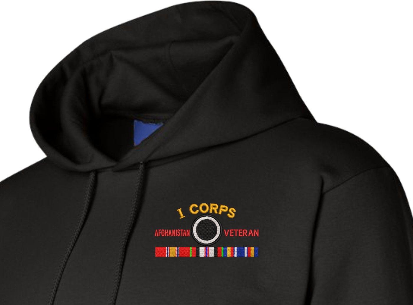 MilitaryBest has expanded its line of apparel with this custom embroidered U.S. Army I Corps Afghanistan Veteran with Ribbons Embroidered Hoodie. Each Hoodie is direct embroidered onto a Champion brand 9.5 oz 50/50 Cotton Poly blend. This Hoodie will make an excellent addition to your wardrobe, or a great gift. Your satisfaction is Guaranteed! These quality hoodies are proudly embroidered at our facilities in Scottsboro, AL. Support the Army MWR program by purchasing only from Licensed Vendors.
