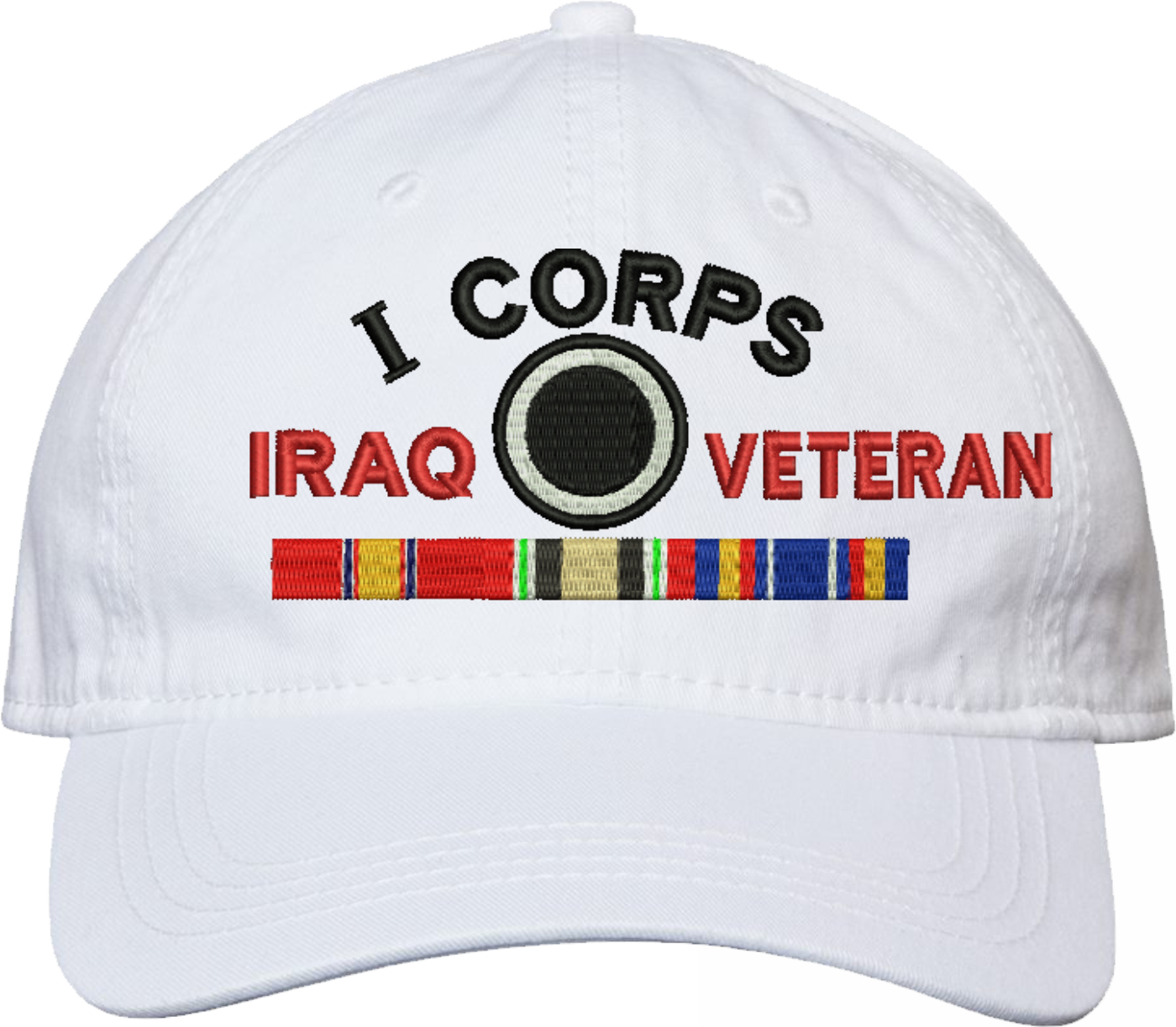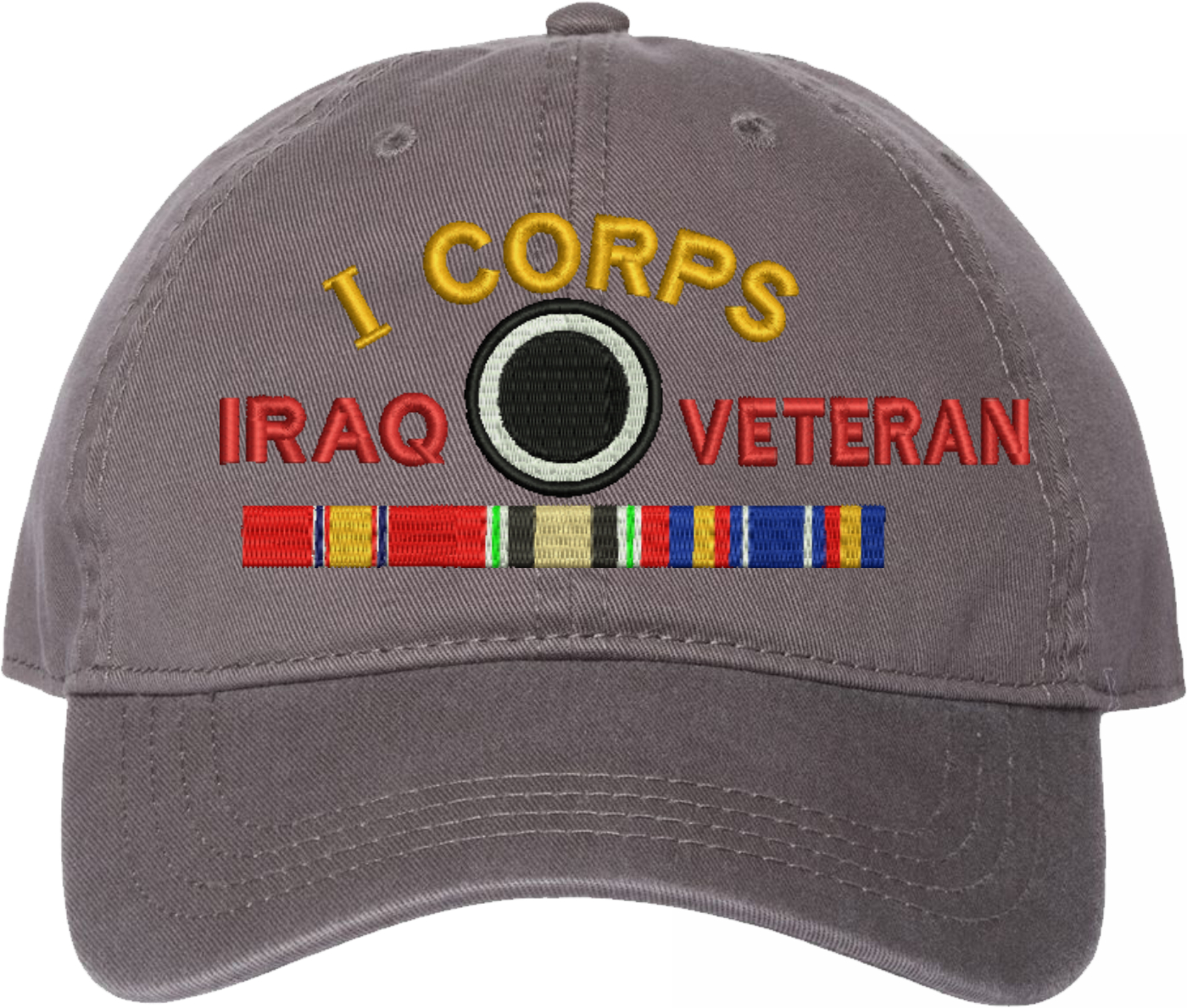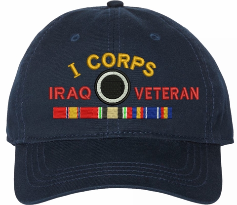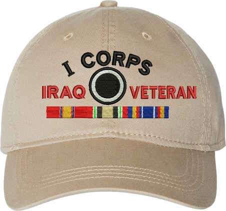 Show your Army pride with this I Corps Iraq Veteran with Ribbons Unstructured Dad Cap from MilitaryBest. Crafted from 100% washed chino twill cotton, this six-panel, low-profile cap offers a relaxed and comfortable fit. Featuring high-quality embroidery done in our Scottsboro, Alabama facility, this cap is designed with a pre-curved visor and an adjustable tri-glide buckle closure for a perfect fit. Whether for everyday wear or as a meaningful gift, this cap is a great way to honor your own or a loved one's service.For caps ordered with custom embroidered personalized text please allow an additional 3 to 5 days production time. All custom back text will be embroidered in ALL CAPITAL LETTERS. Caps with back text or eggs are non-returnable unless there is a material defect in the cap.