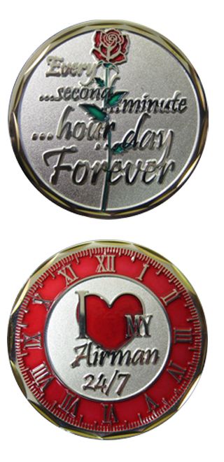 This I Love my Airman 24/7 Challenge Coin is polished bronze with a diamond wave cut edge. Measuring 1 5/8" diameter each challenge coin has the look and feel of quality. Our Challenge Coins are proudly produced, under strict standards, by the nation's leading manufacturer of military products. Each challenge coin would make a great addition to your collection or a wonderful gift.The optional Felt Coin Case can only hold a coin measuring 1 5/8". The coin case has a blue felt exterior and red felt interior.