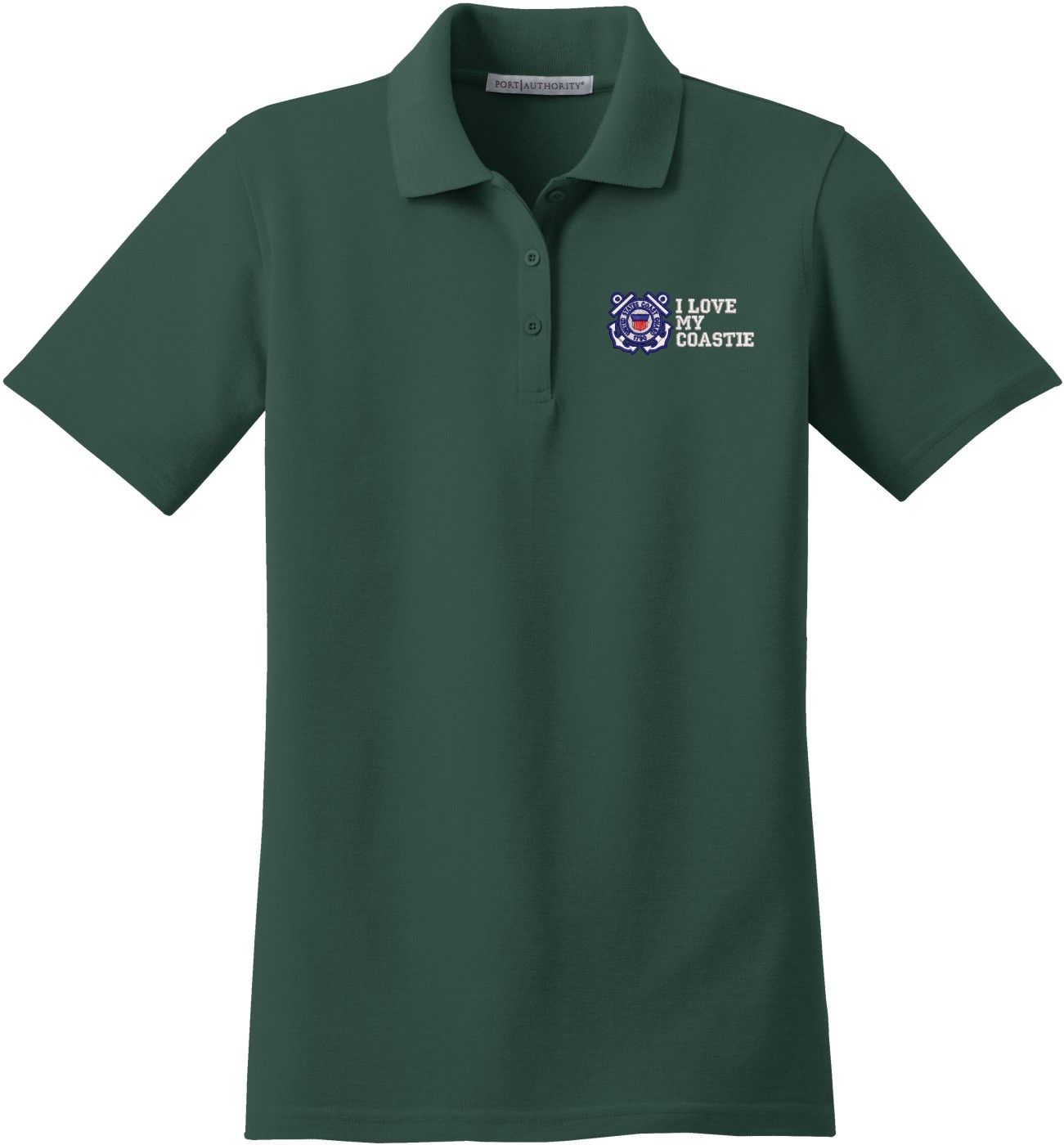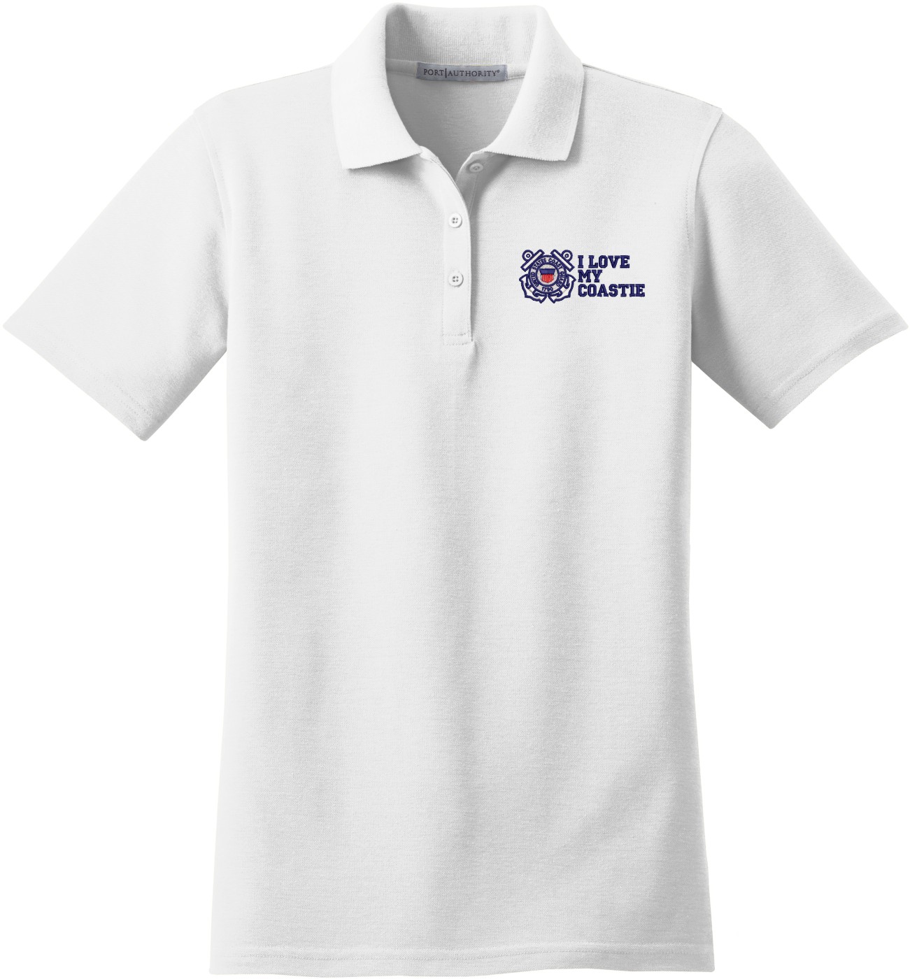MilitaryBest is proud to offer this I Love My Coastie U.S. Coast Guard Women's Stain-Release Polo. This polo is embroidered by our MilitaryBest team in Northeast Alabama. These polos are made with a stain-release finish for long-lasting wear, odor-fighting properties, and superior wrinkle and shrink resistance.Care Instructions: Machine Wash Cold With Like Colors. Do Not Use Fabric Softener. Do Not Bleach. Tumble Dry Low. Warm Iron If Necessary.