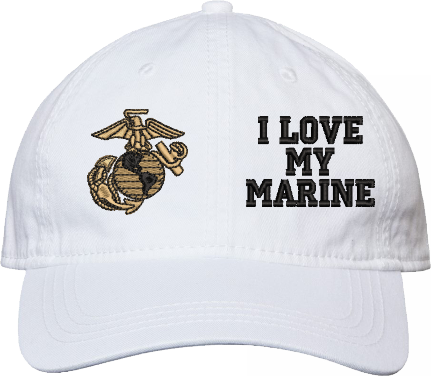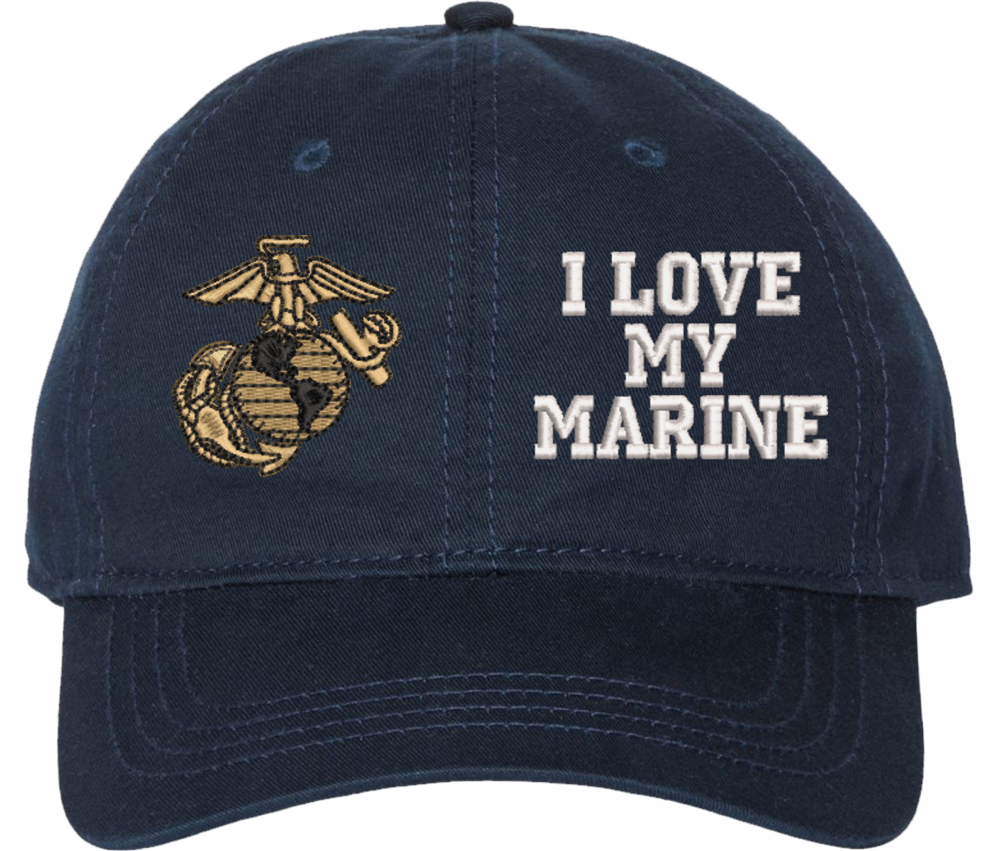 Show your Marine Corps pride with this I Love My Marine U.S. Marine Corps Unstructured Dad Cap from MilitaryBest. Crafted from 100% washed chino twill cotton, this six-panel, low-profile cap offers a relaxed and comfortable fit. Featuring high-quality embroidery done in our Scottsboro, Alabama facility, this cap is designed with a pre-curved visor and an adjustable tri-glide buckle closure for a perfect fit. Whether for everyday wear or as a meaningful gift, this cap is a great way to honor your own or a loved one's service.For caps ordered with custom embroidered personalized text please allow an additional 3 to 5 days production time. All custom back text will be embroidered in ALL CAPITAL LETTERS. Caps with back text or eggs are non-returnable unless there is a material defect in the cap.