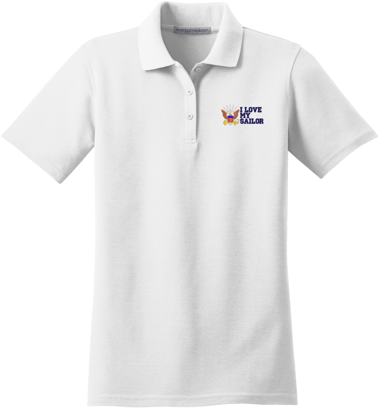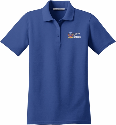 MilitaryBest is proud to offer this I Love My Sailor U.S. Navy Women's Stain-Release Polo. This polo is embroidered by our MilitaryBest team in Northeast Alabama. These polos are made with a stain-release finish for long-lasting wear, odor-fighting properties, and superior wrinkle and shrink resistance.Care Instructions: Machine Wash Cold With Like Colors. Do Not Use Fabric Softener. Do Not Bleach. Tumble Dry Low. Warm Iron If Necessary.