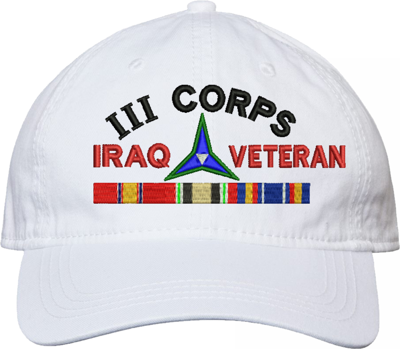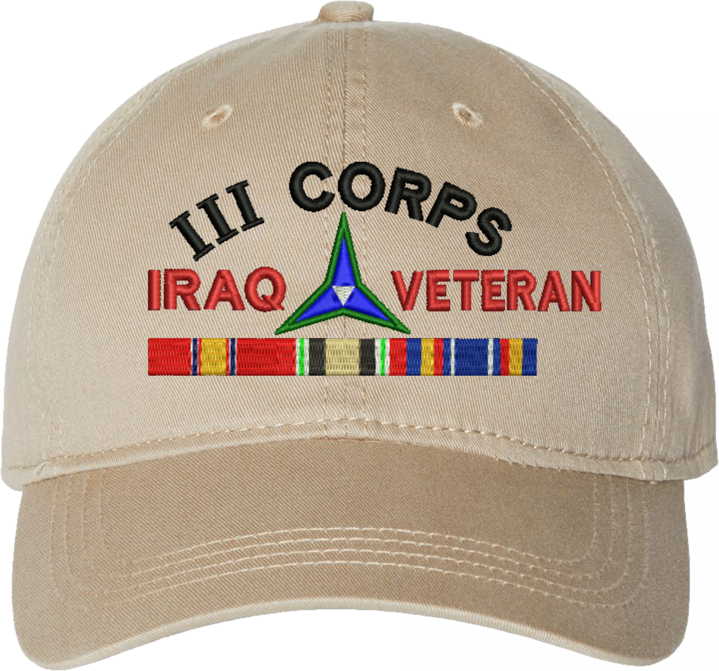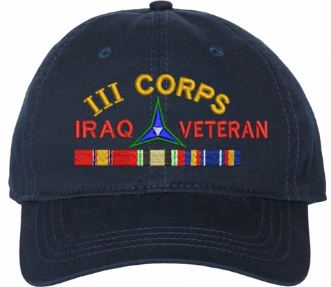 Show your Army pride with this III Corps Iraq Veteran with Ribbons Unstructured Dad Cap from MilitaryBest. Crafted from 100% washed chino twill cotton, this six-panel, low-profile cap offers a relaxed and comfortable fit. Featuring high-quality embroidery done in our Scottsboro, Alabama facility, this cap is designed with a pre-curved visor and an adjustable tri-glide buckle closure for a perfect fit. Whether for everyday wear or as a meaningful gift, this cap is a great way to honor your own or a loved one's service.For caps ordered with custom embroidered personalized text please allow an additional 3 to 5 days production time. All custom back text will be embroidered in ALL CAPITAL LETTERS. Caps with back text or eggs are non-returnable unless there is a material defect in the cap.