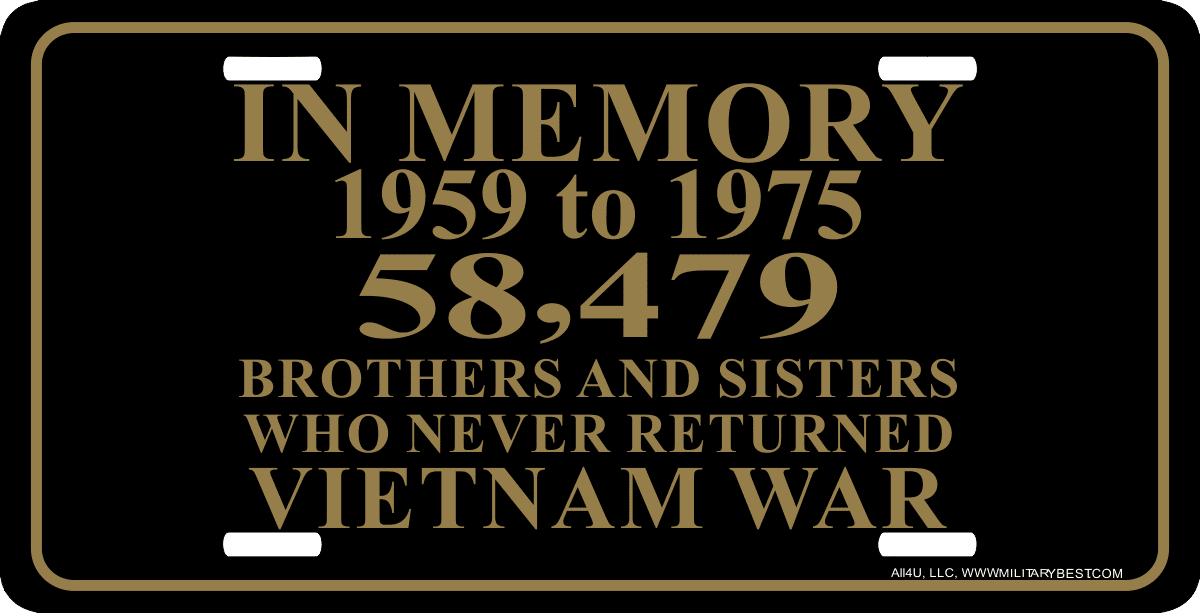 This black metal license plate is a unique way to pay tribute to the veterans of Vietnam, featuring the words "In Memory: 1959 to 1975" and commemorating the 58,479 soldiers lost during the war. 12"x 6". Our License Plates are Proudly Made in the USA.