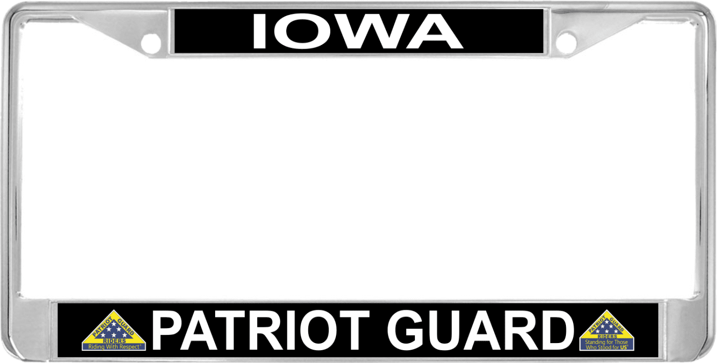 This Iowa Patriot Guard Automobile License Plate Frame is proudly produced at our facility in Scottsboro, Alabama. Each Chrome Dipped Alloy Frame has Poly Coated Aluminum Inserts which allow our production team to provide you with High Quality Designs. Unfortunately, this frame is not offered as a Motorcycle Frame.Please check with your state and local regulations regarding suitability for displaying this Automobile License Plate Frame on your vehicle since these regulations may have changed in your state. Various weather and road conditions may impact the life span of your frame e.g. salted roads, long exposure to direct sunlight etc.