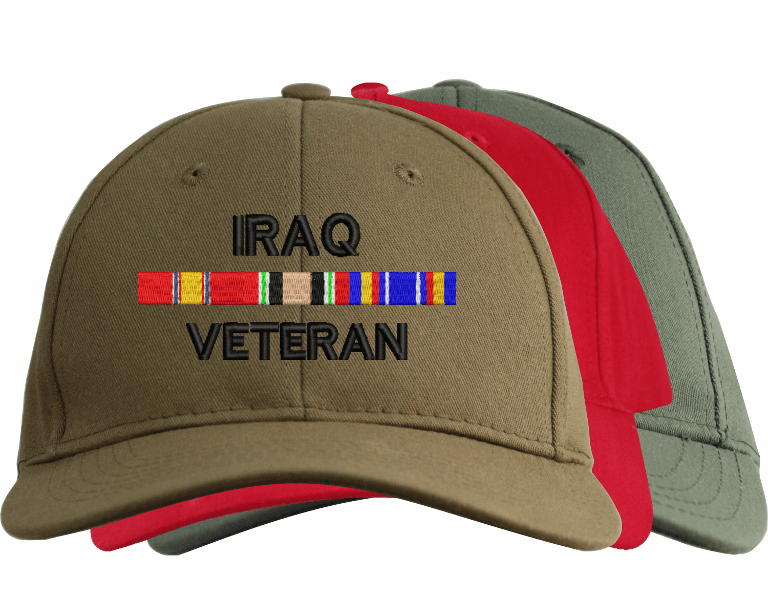 MilitaryBest is proud to offer this Iraq Veteran War Conflict 3-Ribbon Stack Made In USA Cap. This War Conflict Ribbon Cap is embroidered at our facilities in Scottsboro, AL by skilled craftsmen with a passion for patriotism. Your satisfaction is guaranteed!Caps ordered with embroidered back text requires an additional 1 to 2 days of production time. All personalized caps will be embroidered in ALL CAPITAL LETTERS. Caps personalized with back text are not returnable unless there is a material defect in the cap.