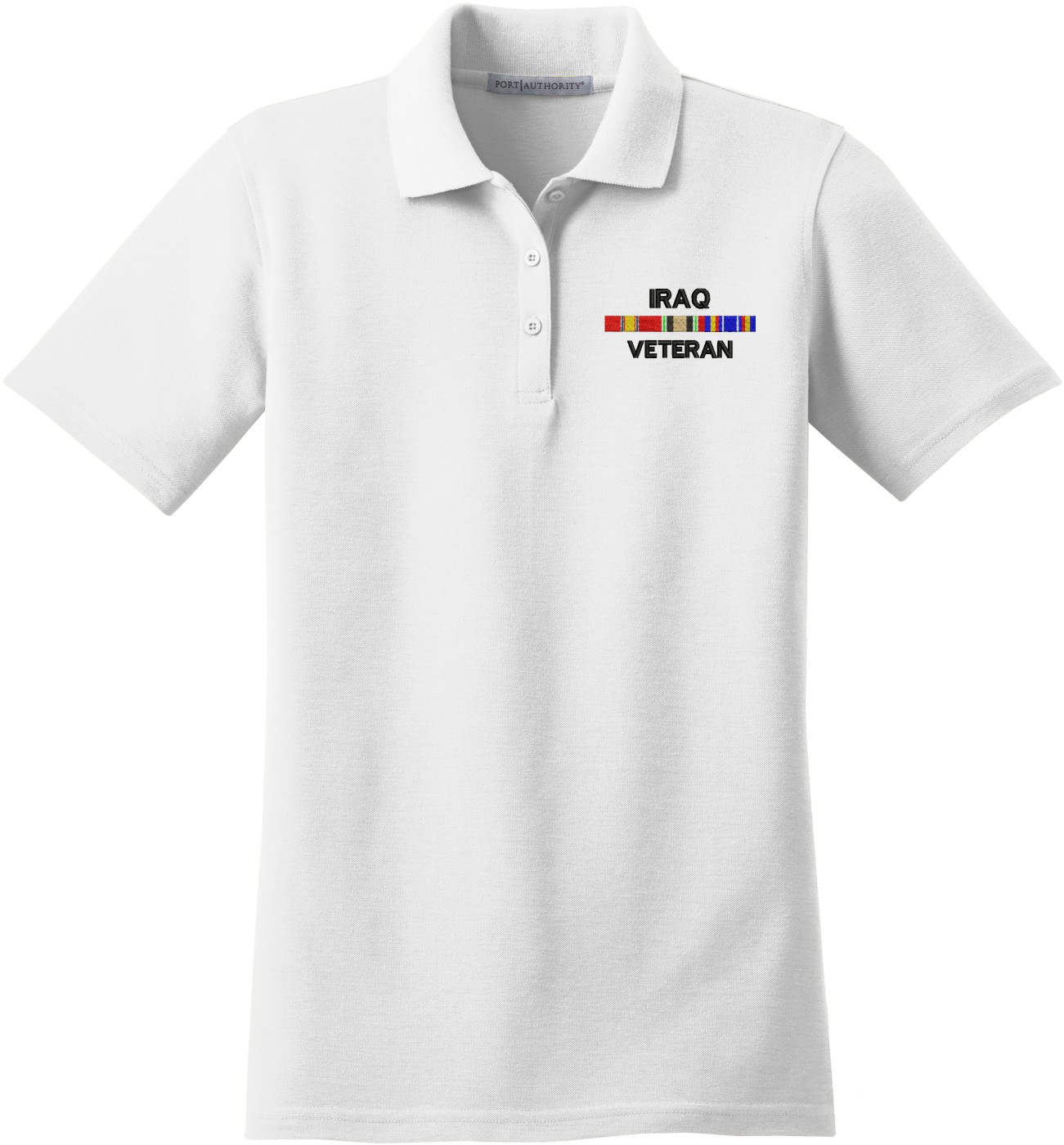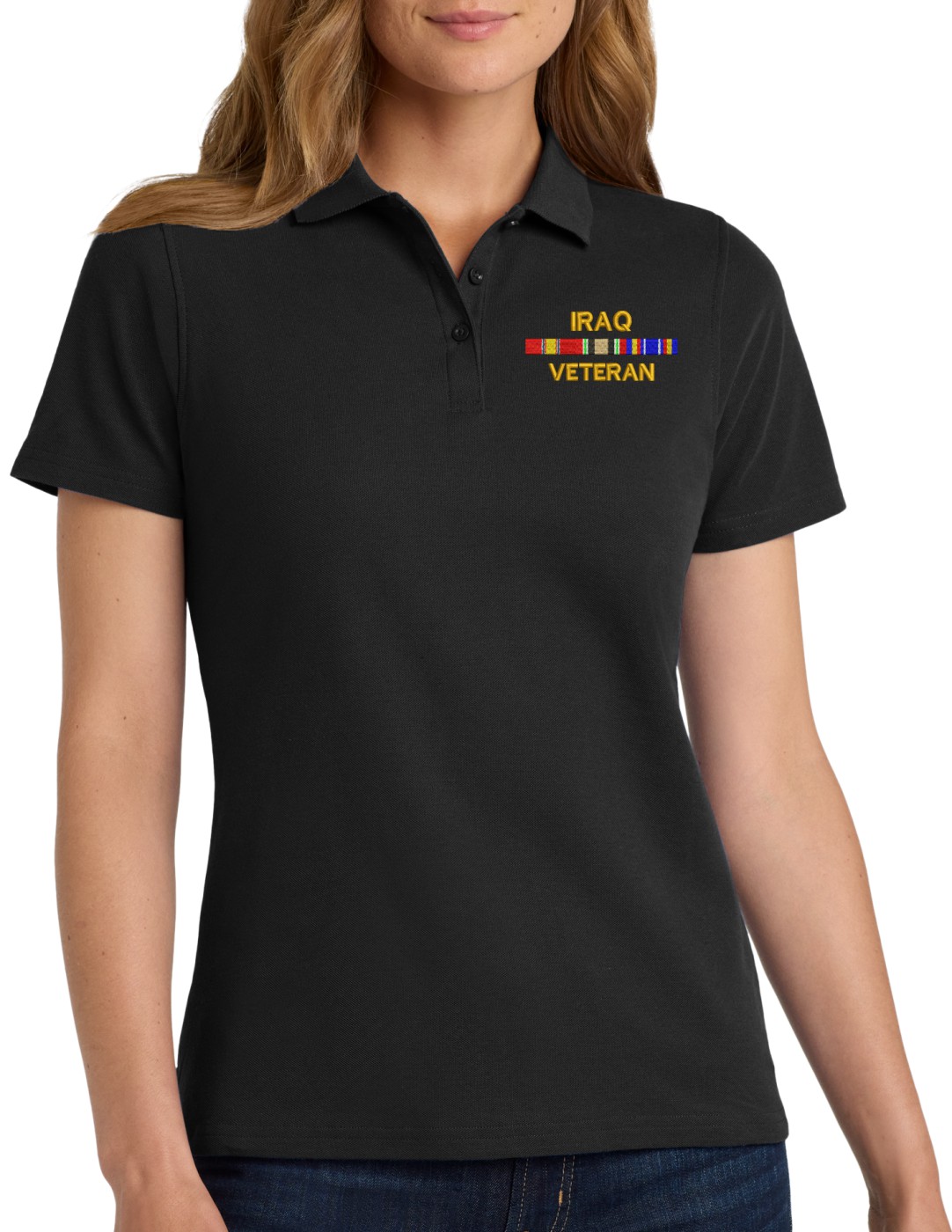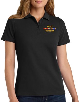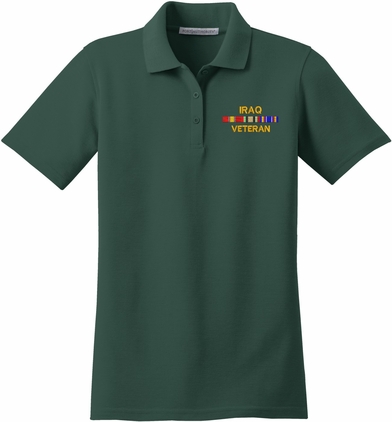 MilitaryBest is proud to offer this Iraq Veteran with Service Ribbons Women's Stain-Release Polo. This polo is embroidered by our MilitaryBest team in Northeast Alabama. These polos are made with a stain-release finish for long-lasting wear, odor-fighting properties, and superior wrinkle and shrink resistance.Care Instructions: Machine Wash Cold With Like Colors. Do Not Use Fabric Softener. Do Not Bleach. Tumble Dry Low. Warm Iron If Necessary.