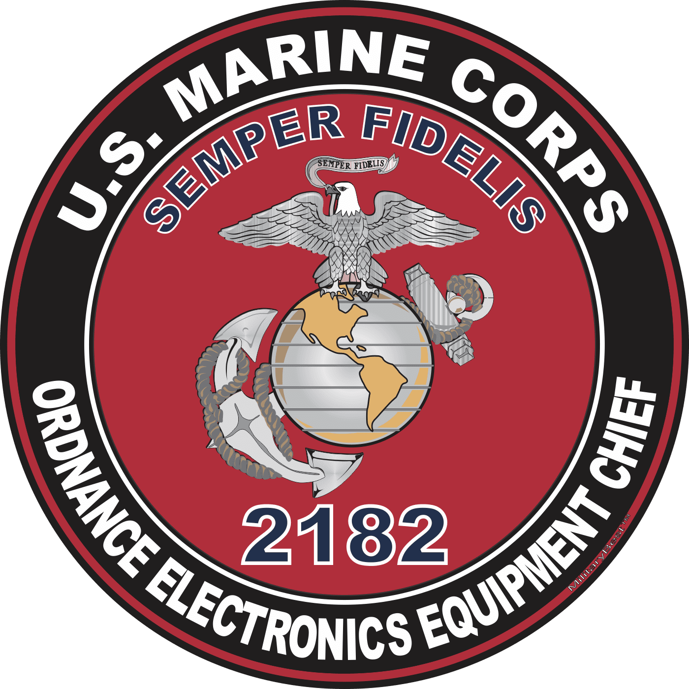 MilitaryBest is proud to offer this U.S.M.C. MOS 2182 Ordnance Electronics Equipment Chief Decal. This U.S. Marine Corps MOS Decal is a great way to show your Marine Pride. All MilitaryBest Marine Corps stickers are printed using high-quality vinyl and U.V. resistant ink. Each is then cured, laminated and die cut for a beautiful crisp, clean and professional look. This U.S.M.C. MOS 2182 Ordnance Electronics Equipment Chief Decal, as well as, any other MilitaryBest.com decal is proudly Made in the USA at our facilities in Scottsboro, AL. Select desired quantity and size from the menu above.Features:
