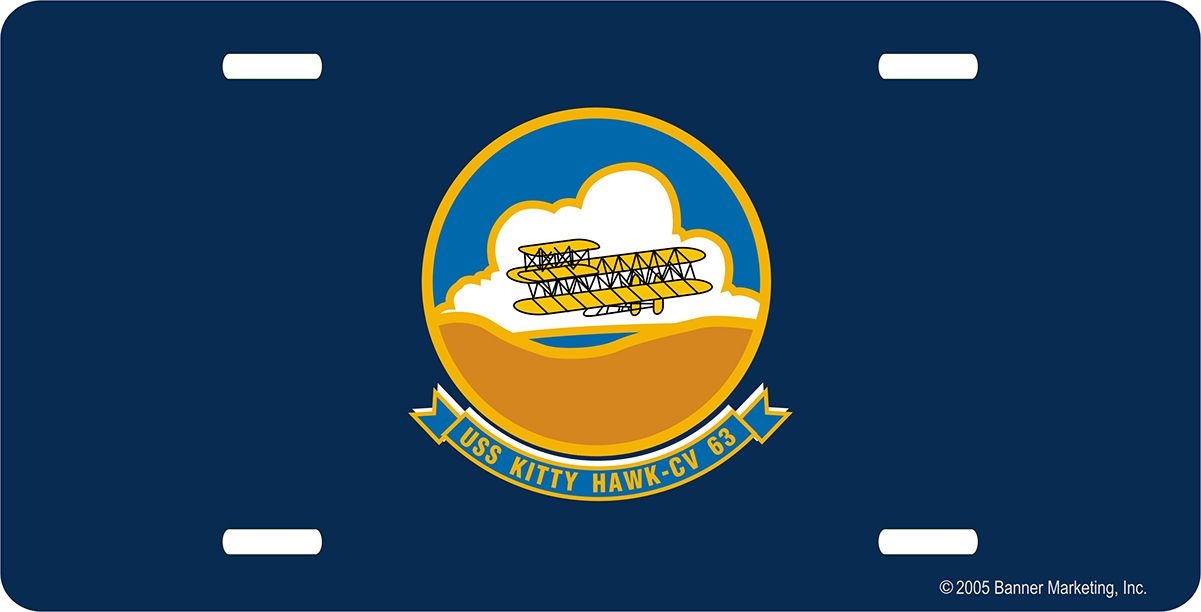 This USS Kitty Hawk CV-63 License Plate is made from heavy gauge aluminum and has a baked enamel finish to last for many years of use. Each plate measures 5 15/16" x 11 15/16". This license plate would make a wonderful addition to your collection or a great gift.