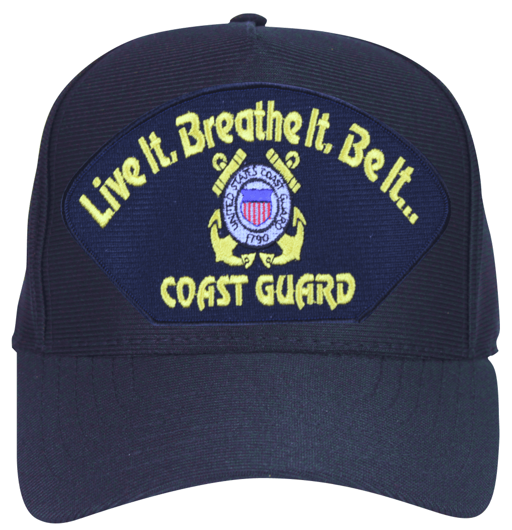 This Live it, Breathe it, Be it ... Coast Guard with Emblem Ball Cap is an emblematic, poly, dark under the visor cap. Each has an adjustable strap, and is available as a 5 panel high profile or 6 panel low profile cap. All MilitaryBest caps are fully guaranteed. Some people call them Military Covers or Military Hats. This Military Cap is proudly Made in The U.S.A.For caps ordered with custom embroidered personalized text please allow an additional 3 to 5 days production time. All custom back text will be embroidered in ALL CAPITAL LETTERS. Caps with back text or eggs are non-returnable unless there is a material defect in the cap. If a style is not selected the cap will be made using a high profile style cap as pictured.