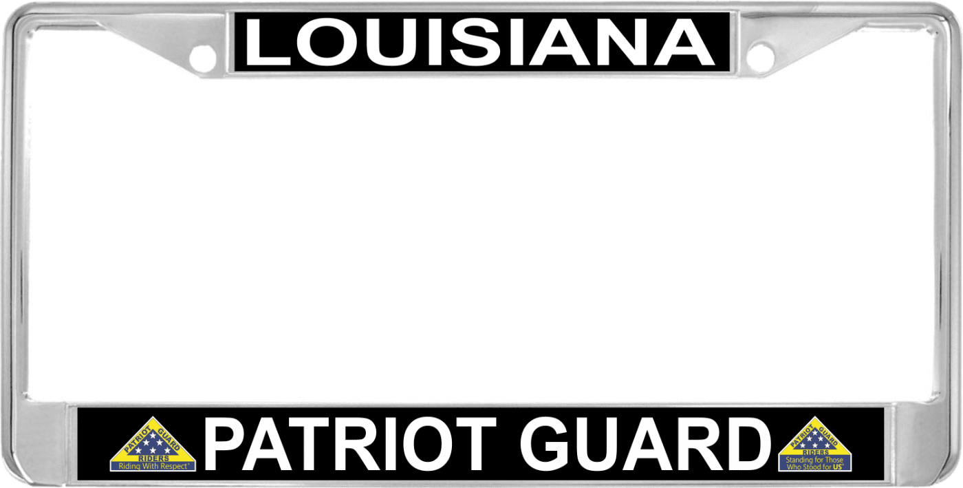 This Louisiana Patriot Guard Automobile License Plate Frame is proudly produced at our facility in Scottsboro, Alabama. Each Chrome Dipped Alloy Frame has Poly Coated Aluminum Inserts which allow our production team to provide you with High Quality Designs. Unfortunately, this frame is not offered as a Motorcycle Frame.Please check with your state and local regulations regarding suitability for displaying this Automobile License Plate Frame on your vehicle since these regulations may have changed in your state. Various weather and road conditions may impact the life span of your frame e.g. salted roads, long exposure to direct sunlight etc.