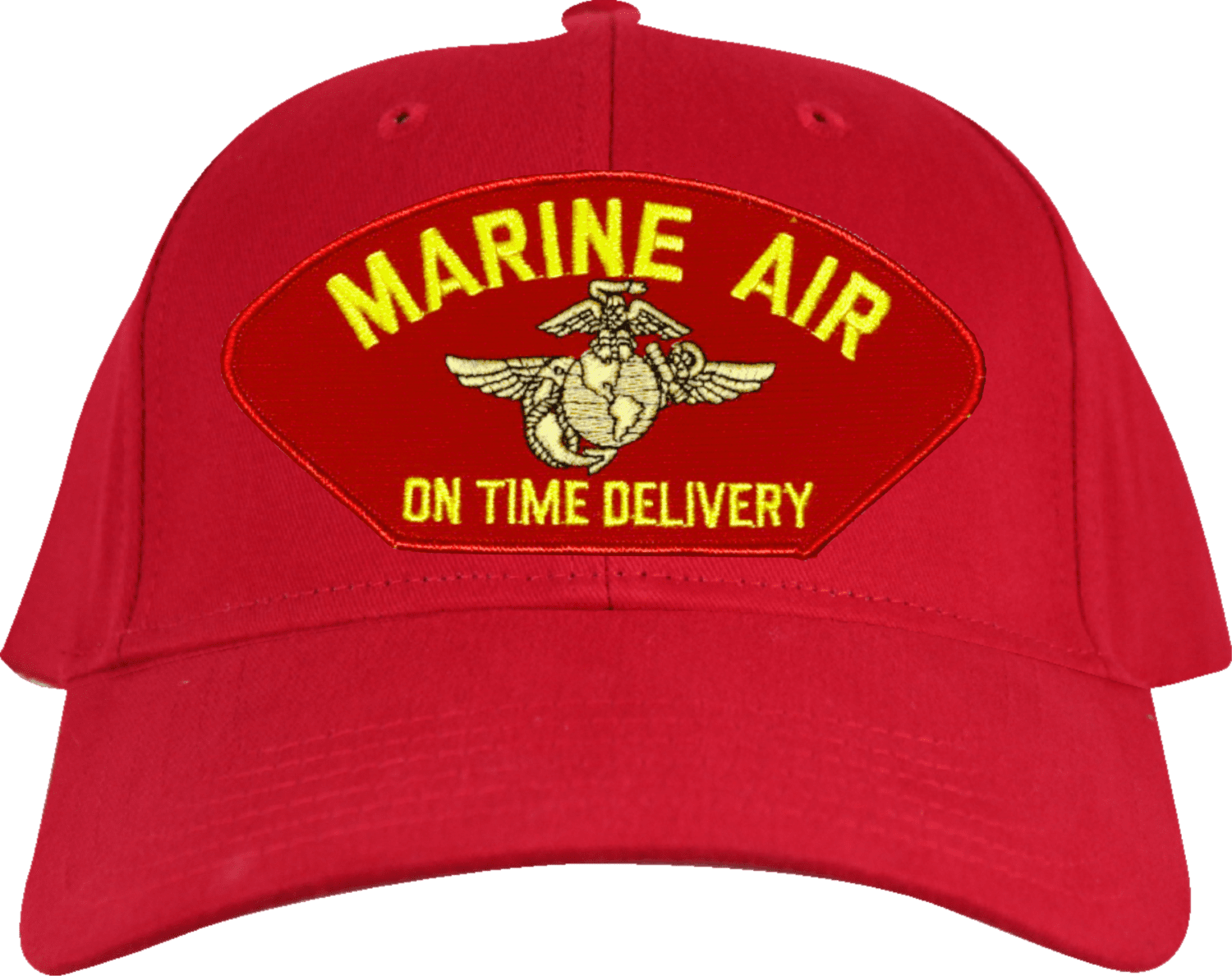 This Marine Air On Time Delivery Red Cap, is proudly Made in The U.S.A., has an adjustable strap, and is a 6 panel low profile cap.We will be glad to include scrambled eggs, which is an embroidered gold oak leaf added to the brim of the cap. For caps ordered with custom embroidered personalized text please allow an additional 3 to 5 days production time. All custom back text will be embroidered in ALL CAPITAL LETTERS. Caps with back text or eggs are non-returnable unless there is a material defect in the cap. If a style is not selected the cap will be made using a high profile style cap as pictured.
