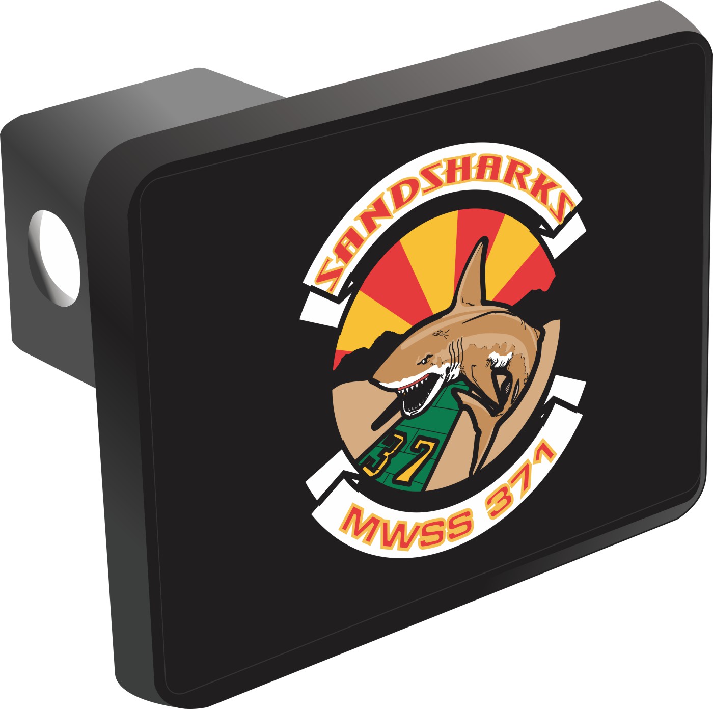 This Marine Wing Support Squadron MWSS 371 Sandsharks Hitch Cover is proudly Made in the USA. Each Hitch Cover's face plate measures 4.7" x 3.4" and is applied on a black heavy duty injection molded plastic 2" hitch cover; link pin not included. The face plate of the hitch cover is sublimation printed to provide a beautiful glossy finish sure to catch the eye. This hitch cover would make a wonderful addition to your truck or other vehicle.A percentage of the sale of each MilitaryBest item is forwarded to the licensing departments of each respective branch of service in support of the MWR (Morale, Welfare, & Recreation) program. These payments are made by either ALL4U LLC or the wholesaler from where the item originated. Our team thanks you for your service and your support of these programs.